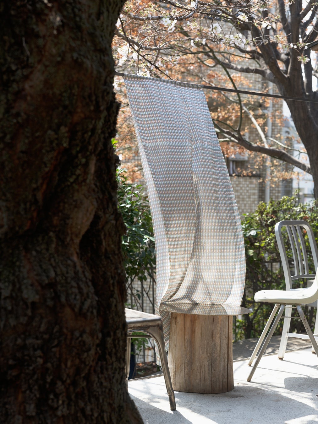 国内外で活躍するテキスタイル作家・森山茜が、舟久保織物とともにインテリアや空間演出における織物の新たな可能性を提案し、インテリア業界との接点を創出します。現在では貴重となった「ほぐし織」(タテ糸を染め上げてから仮織りしていたヨコ糸をほぐして抜き、織り上げることで生地の柄が掠れ、柔らかく奥行きを感じる織物に仕上がるのを特徴とし、ヨコ糸の色を変えて織り上げる)の技術を使った大型のカーテン作品を制作。