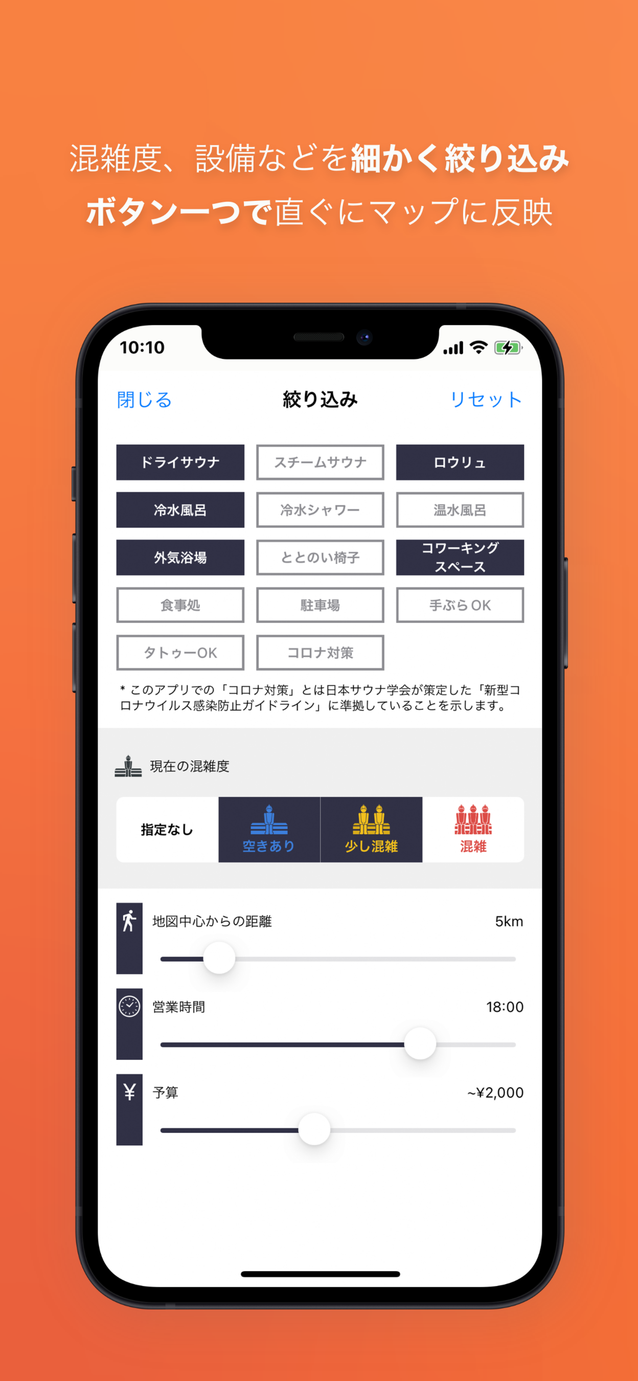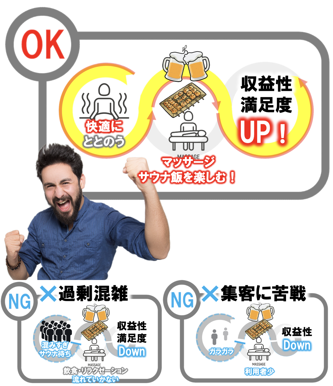 過剰に混雑していると、波待ちしているサーファーのように、お風呂に入りながらサウナ室が空くのを待つ人が増えます。結果、利用者の回転率が悪くなり、温浴施設の収益源である飲食やリラクゼーションへお客さんが回らなくなります。さらに、お風呂が混みますのでサウナ目的ではないお風呂目的のお客さんの不満が増します。このように過剰に混雑することは、見かけ上良さそうに見えますが、収益性やお客さんの満足度を減少させ、常連客を追い出し、長期的収益性を悪化させます。本アプリにより分散してサウナ施設を利用することでこの問題を防げるのではないかと思います。