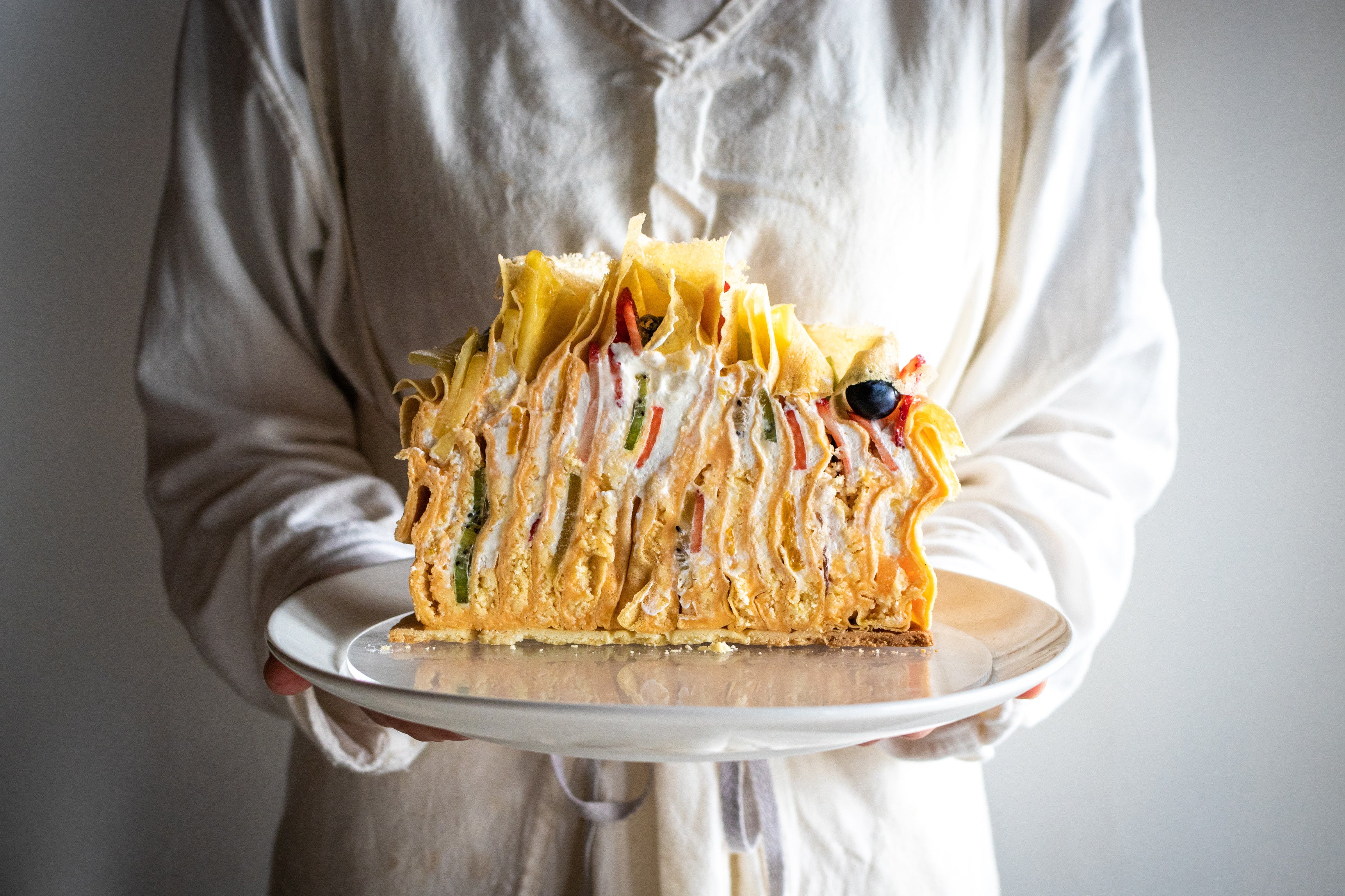 一般的なミルクレープは、どれもフルーツとクリームとクレープ生地を上に積み上げて作るもの。