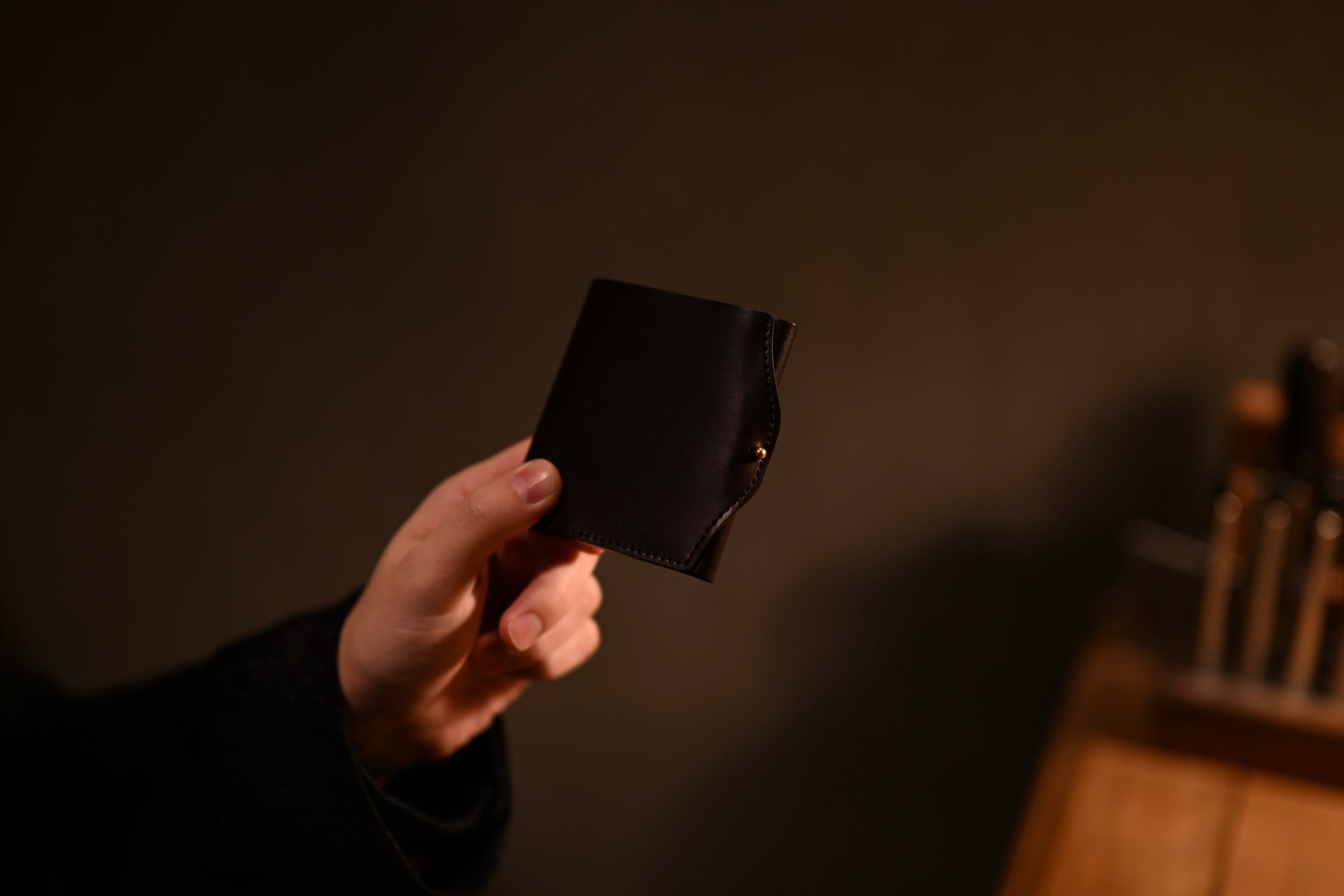 折り財布なのに小銭とカードが重ならず、無駄な厚みが出ない設計です。また、通常では革や収納物と一緒に重なってくるボタンの代わりにサイドにギボシ(ギボシver.)を配置することで、ボタンの厚みの影響を受けない構造になっています。