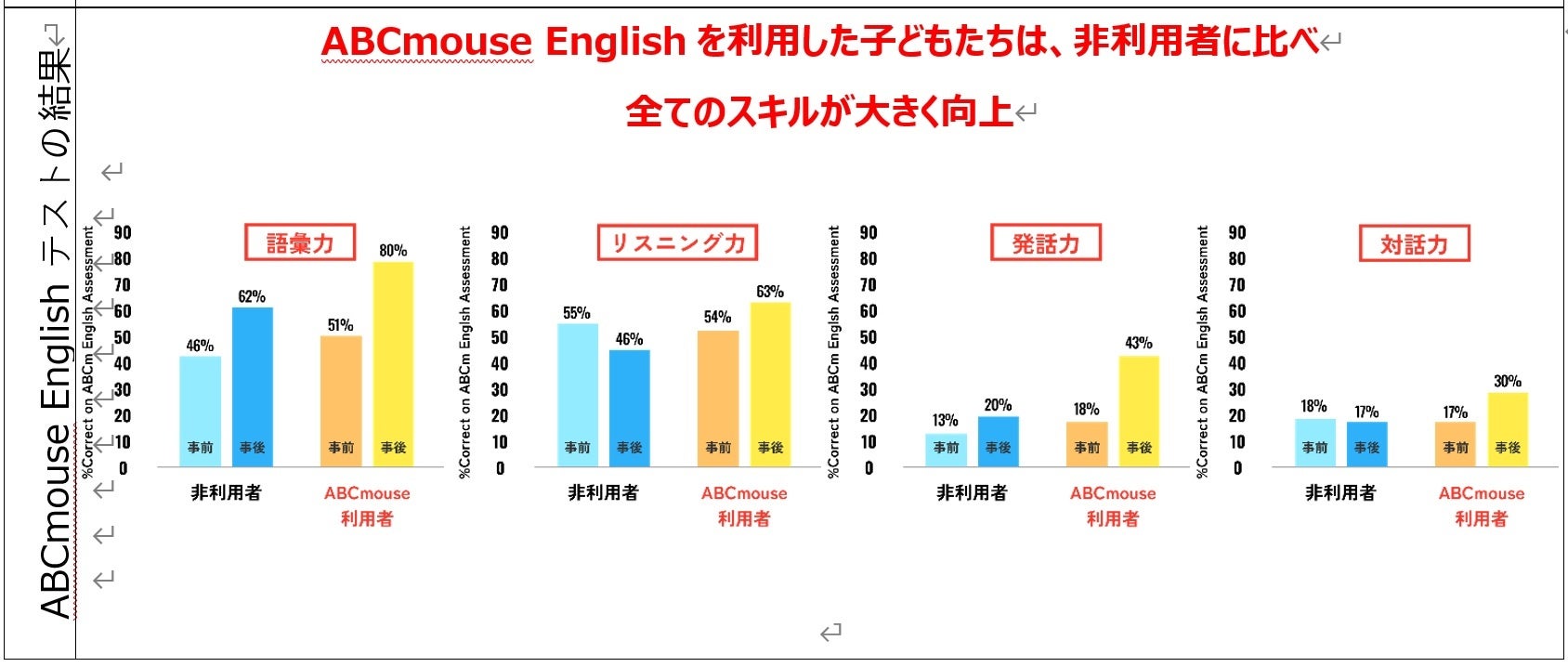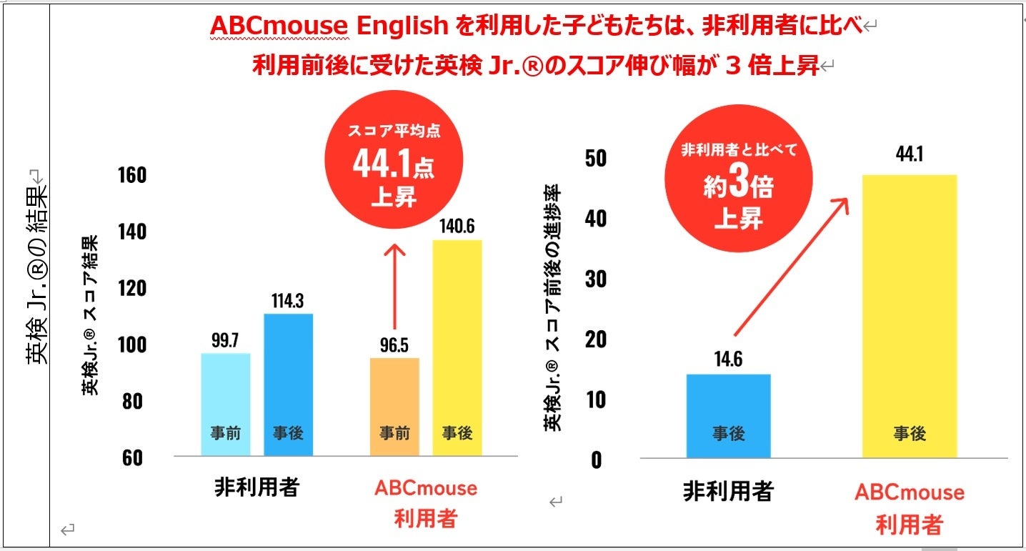 それぞれ2 種類を実施した結果、調査開始前は利用者・非利用者ともに英語力はほぼ同じレベルだったものが、「ABCmouse English」を利用した子どもたちは、非利用者に比べて利用前後に受けた英検Jr.®のスコア伸び幅が3 倍上昇し、さらにABCmouse English テスト語彙力、リスニング力、発話力、対話力のスキルが向上したことが明らかとなりました。