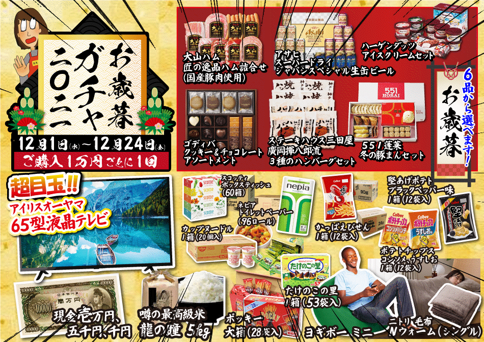 年末恒例のビッグイベント!今年の目玉は大型65インチテレビ。お歳暮やSwitch、ヨギボーミニなど豪華景品が勢揃い!