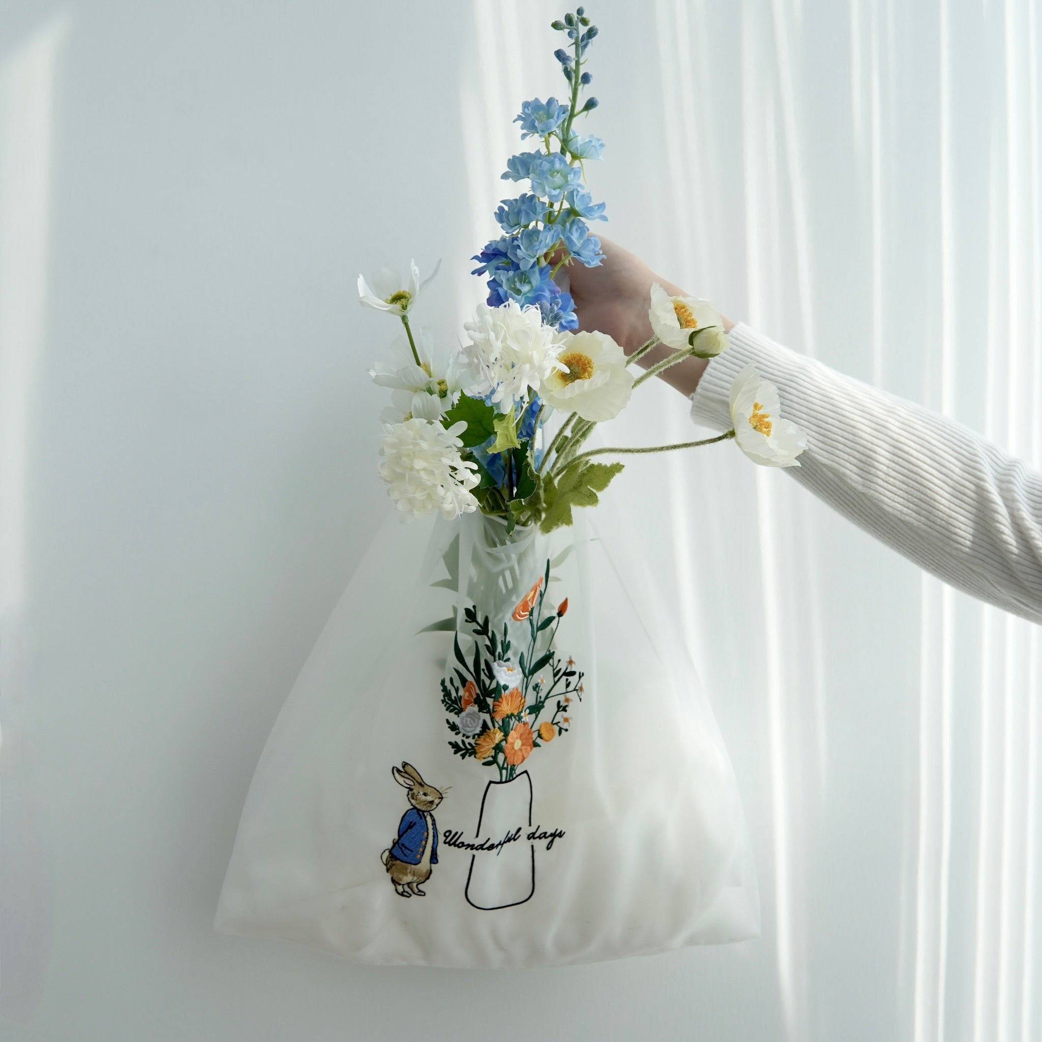 GAACALオリジナルデザインのマルシェバッグの、ピーターラビット™デザインです。ピーターが見上げる先には、花瓶に飾られた鮮やかな花々。それぞれしっかりと存在感がありながら、お互いを引き立て合う、程よいバランス感が魅力です。