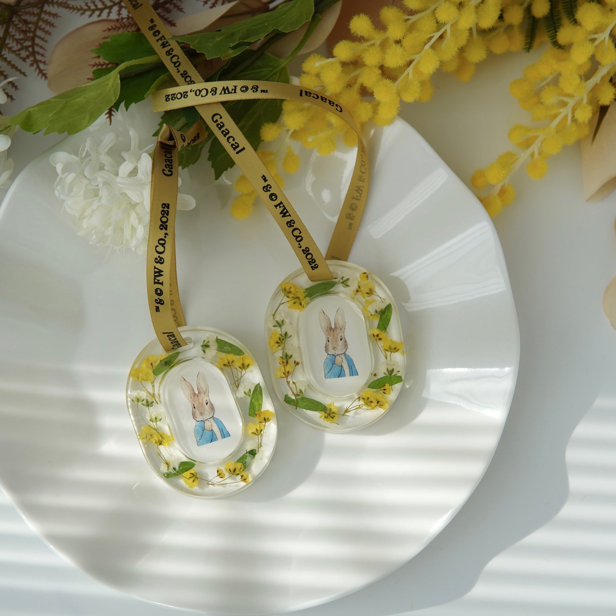 GAACALの押し花×ピーターラビット™のアロマサシェ。黄色と白の花々がピーターの周りを彩ります。視覚だけでなく嗅覚からも癒されるボタニカルな香りのアロマです。