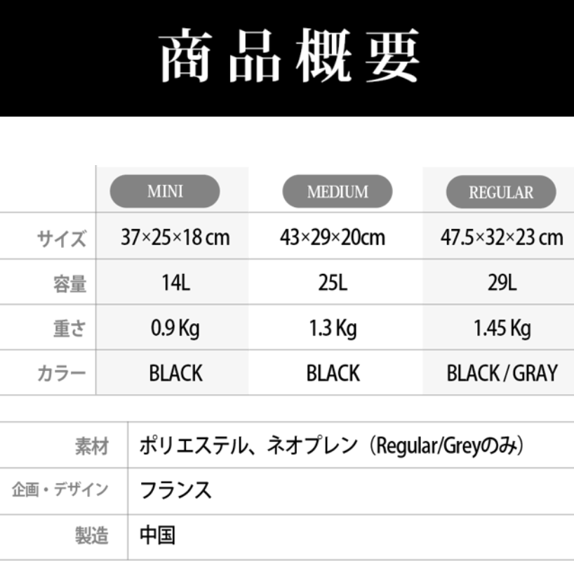 さらにREGULAR・MEDIUMには、ランドリーバッグ、レインカバー も付属します。