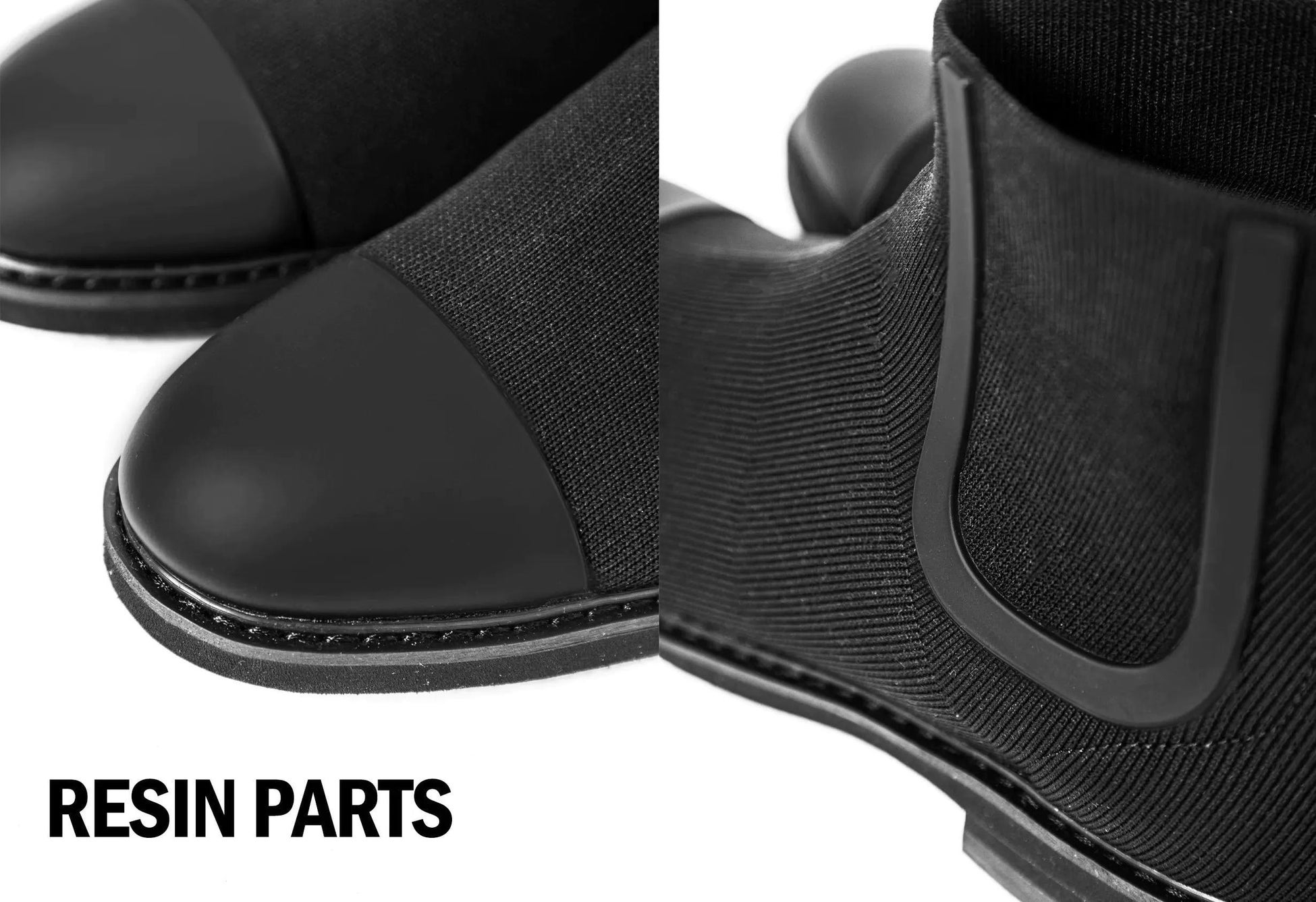 爪先部分には耐久性、撥水性を向上させる樹脂パーツを採用。足首部分のデザインの最大の特徴は、U字に配置した樹脂パーツの内側部分と外側部分を、伸縮性のある糸と形状をしっかりと形作る糸を使い分けながら一体編みをしている点です。そのため接合部分がなく、水の侵入を防ぐことが可能に。足あたりも良く、フィット感もしっかりしています。