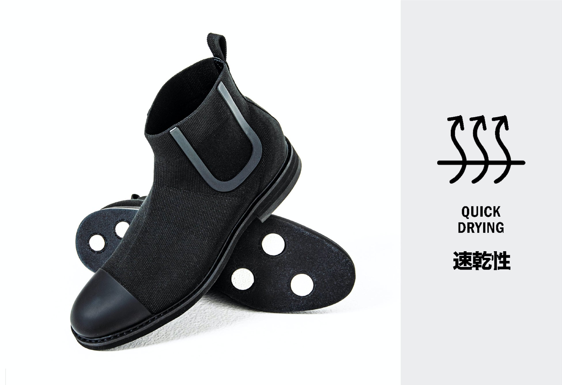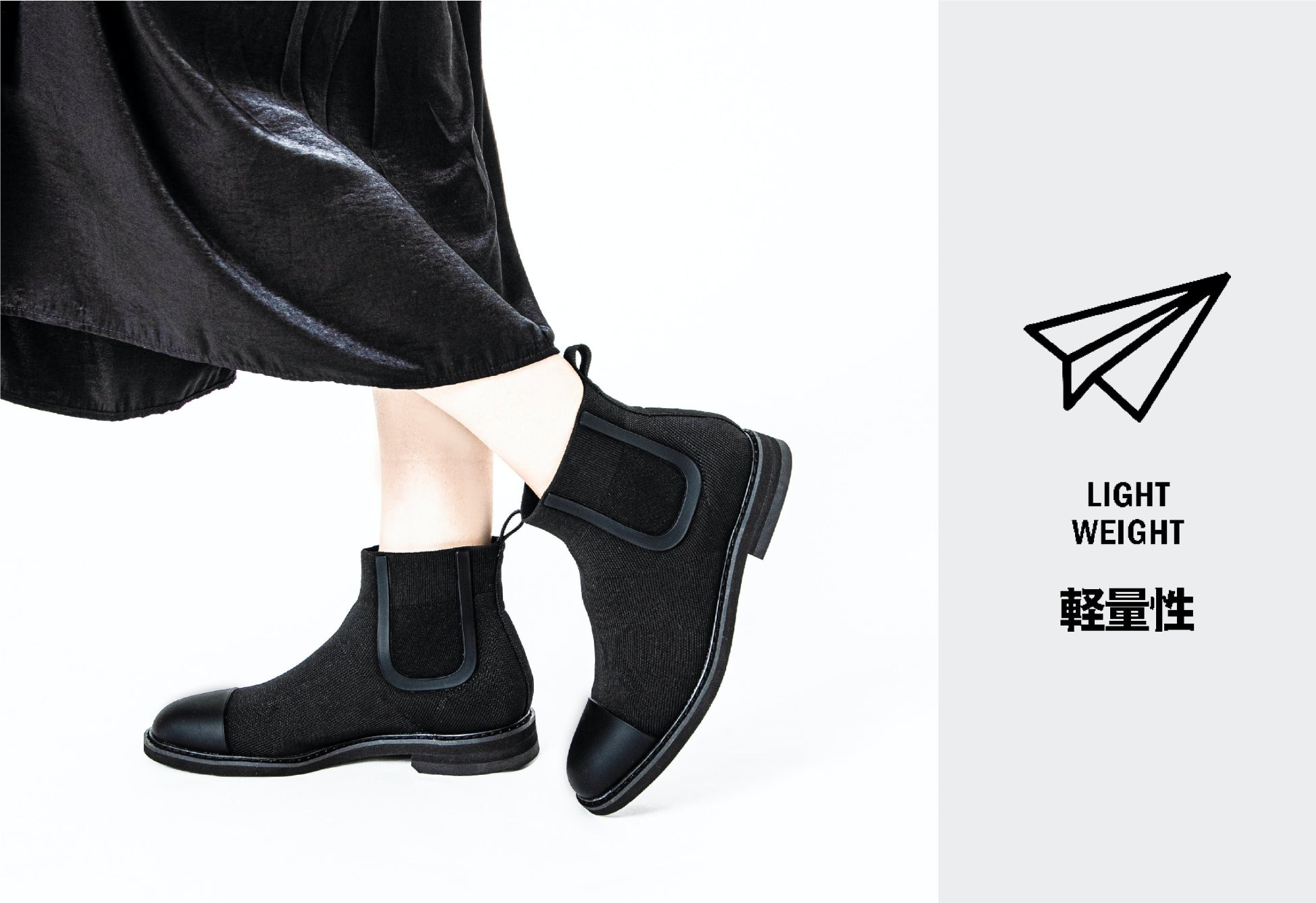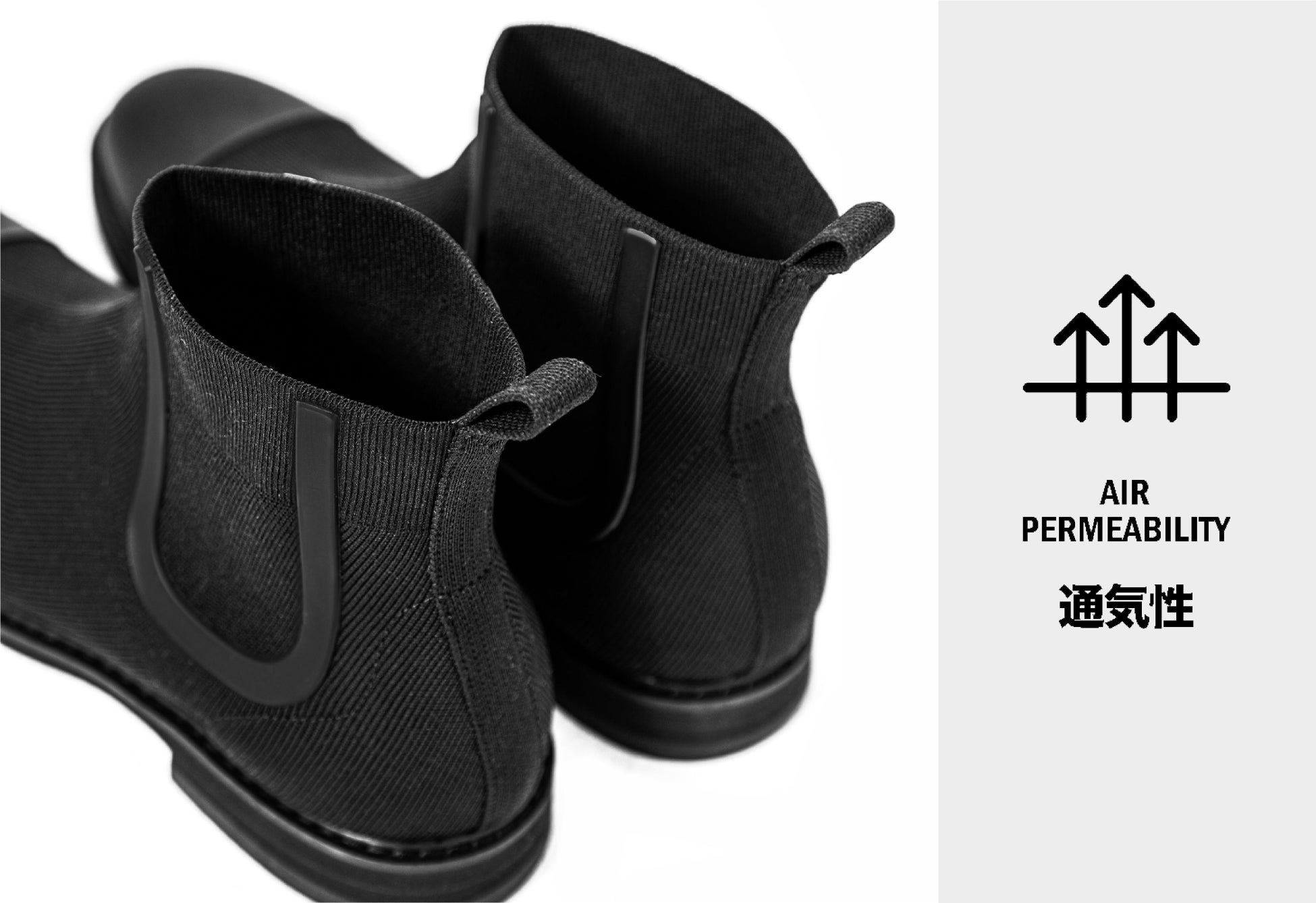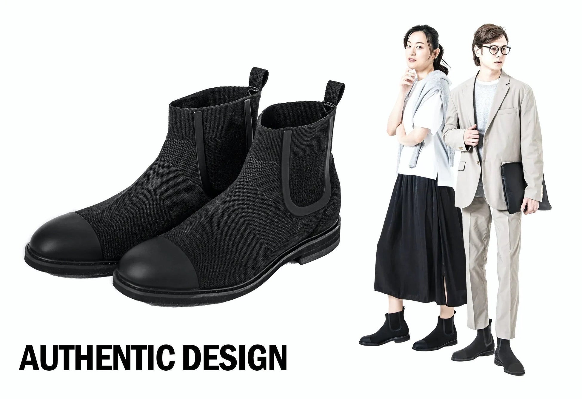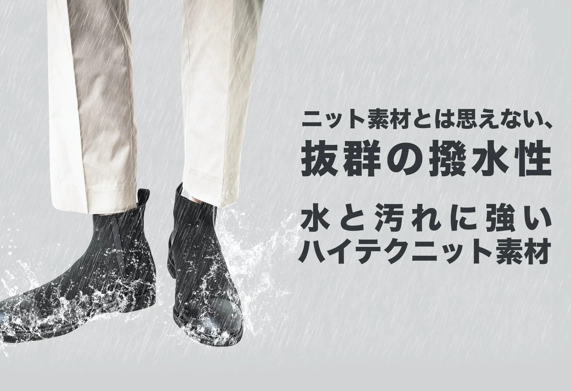 水に強く、蒸れにくく、歩きやすい。革新的な最新テクノロジーを搭載したニット素材のビジネスシューズブランド「+F+(エフ)」が、ファッション性が高く、雨の日も使いやすいサイドゴアブーツタイプを開発。通常ブーツは構造上、通気性が悪く蒸れやすい、重いなどのネガティブポイントを抱えるものもあります。今回の「ACTHREAD CHELSEA BOOTS」では、ハイテクニット素材アクスレッドを活用することで、通気性が良いうえに水にも強いブーツが完成しました。華美な装飾を抑え、シンプルなトーンにまとめたことで、ビジネスカジュアルなセットアップとも相性良くお使いいただけます。オン・オフ問わず、雨の日も晴れの日にも使っていただける全天候型シューズとして機能します。