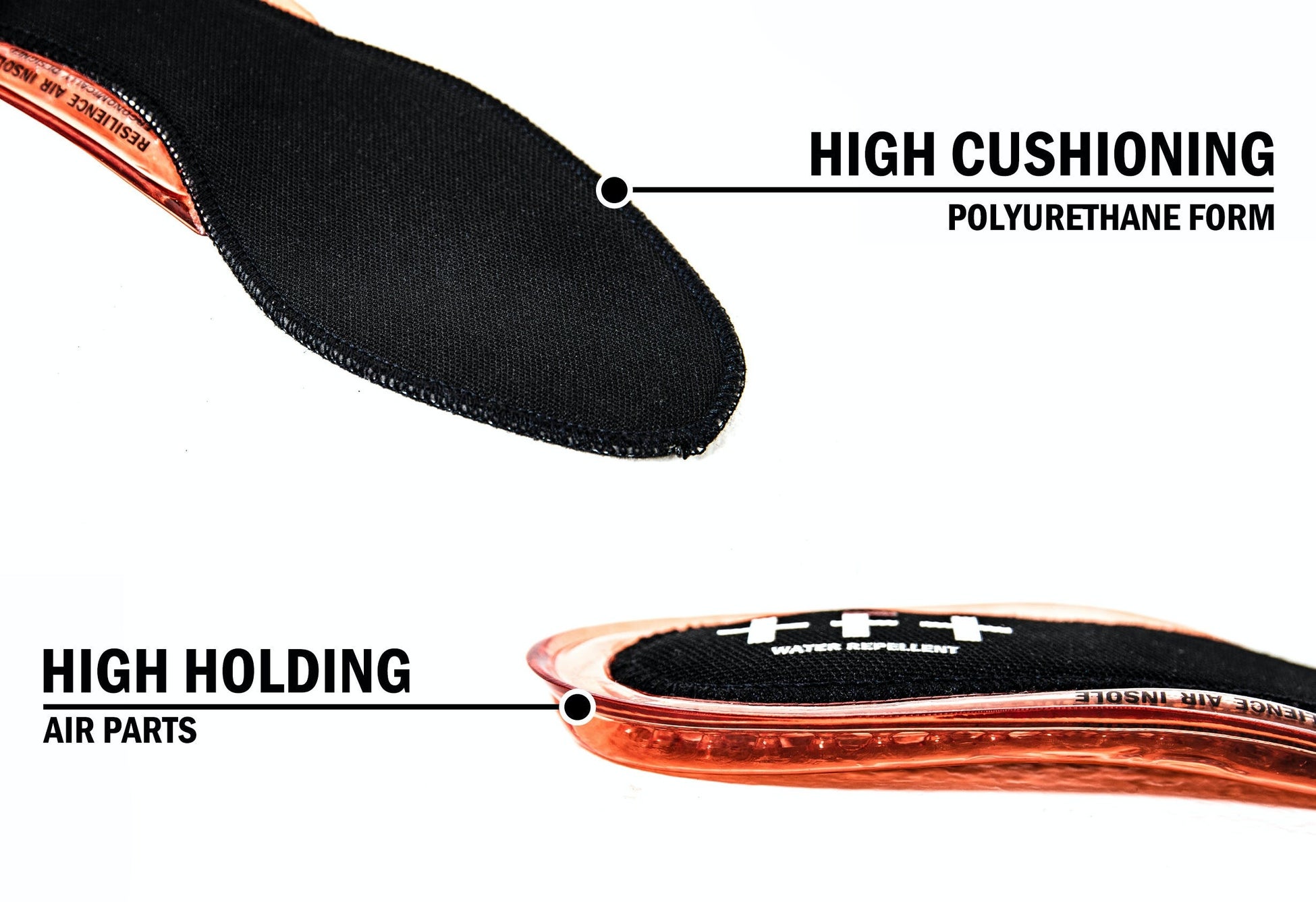 歩行時にエアーパーツが衝撃を吸収し、アーチを支え、かかとから土踏まずにかけてしっかりホールド。膝や腰への負担を軽減する設計になっています。また、素材にポリウレタンフォームを使うことで優れたクッション性も兼備させました。