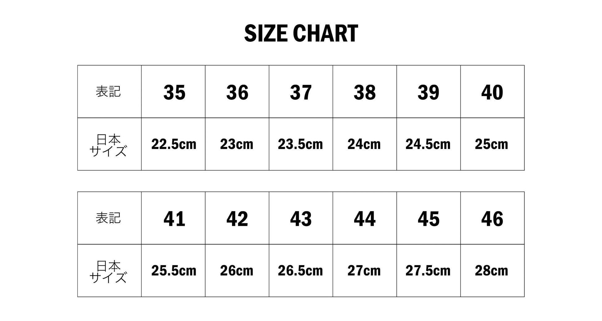 展開アイテムとサイズチャート