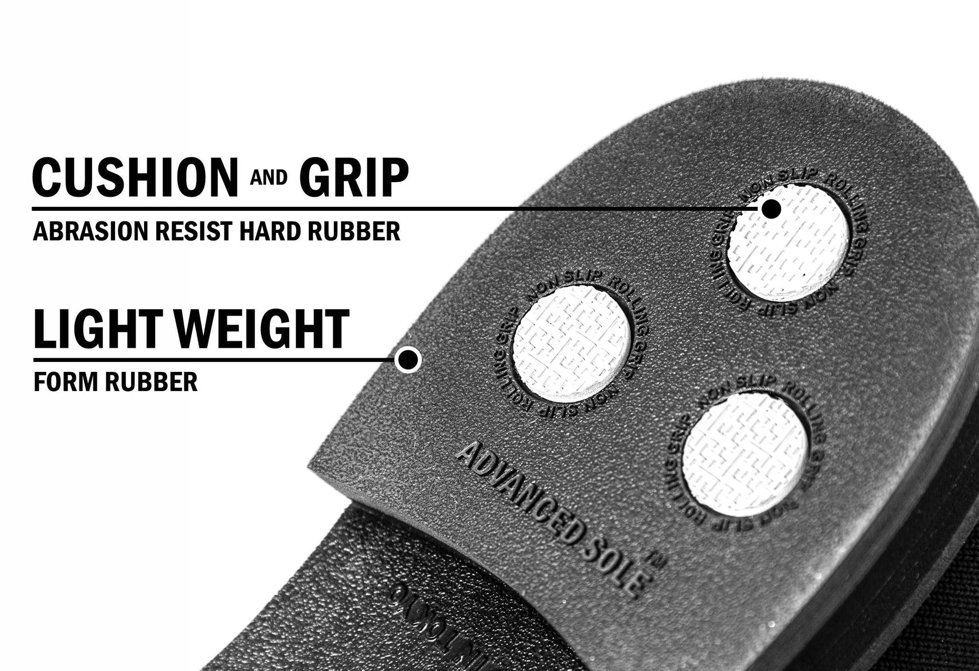 軽量かつ衝撃吸収性に優れた発泡ゴムをベースに、耐摩耗性の高い硬質ゴムを適所に配置。クッション性とグリップ性を同時に備えているのが特徴です。特にかかと部分には摩耗に耐える素材配合になっています。水はけがよく、雨の日のはき心地も快適です。