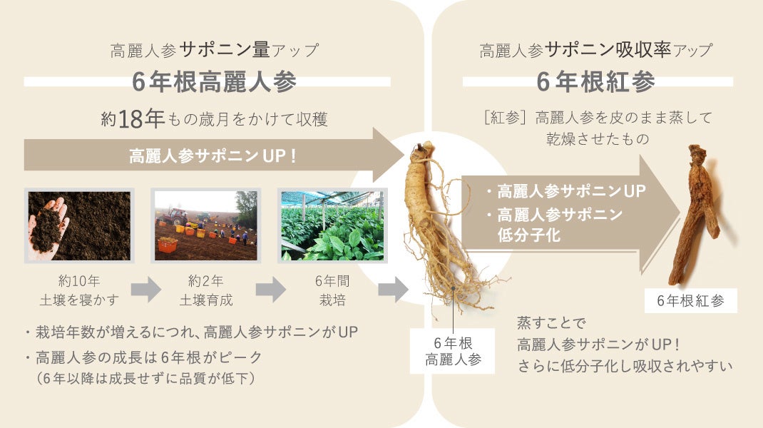 80年以上の歴史のある高麗人参農場「参愛農場」協力のもと、高品質の低温熟成6年根紅参のみを使用しています。