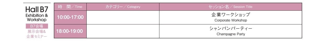 B7ホール(展示会場・Workshop(企業セミナー)) : 10:00~19:00 ※10:00受付開始
