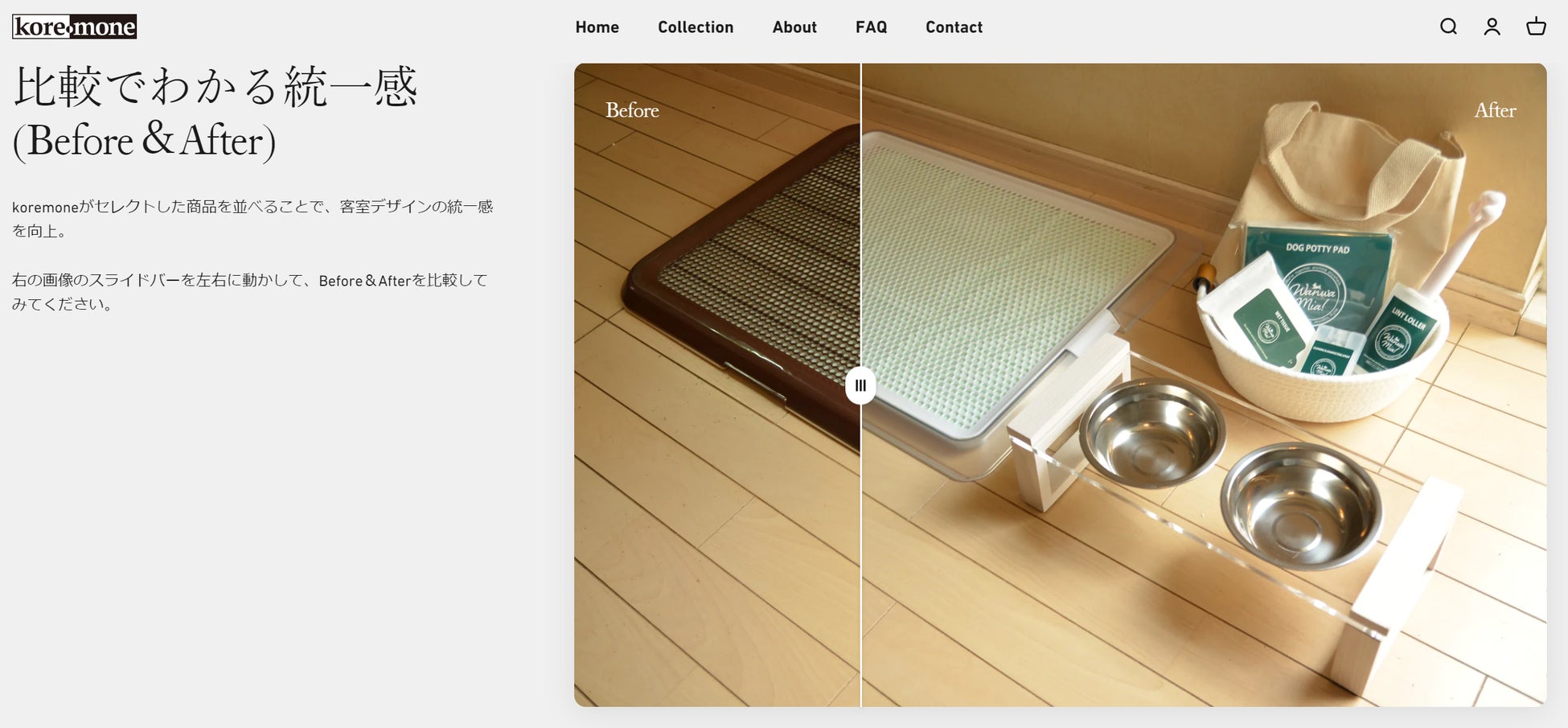 またECサイト上には商品配置のイメージ機能を掲載しており、スライドバーを左右に動かすことで、koremone取り扱い商品の配置前と配置後のイメージをBefore&Afterで表示。ひとまず用意したペット用品と統一感を意識して揃えたペット用品を見比べることができます。