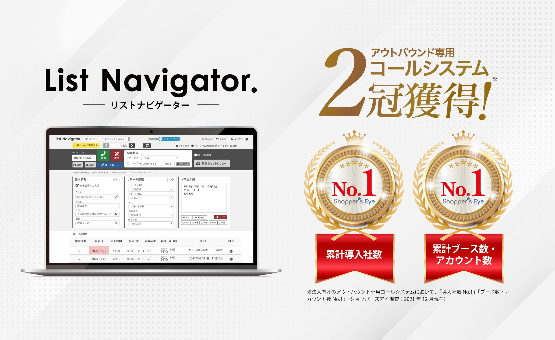 アウトバウンド専用コールシステム『List Navigator.』を開発・提供する株式会社Scene Live(本社:大阪府大阪市、代表取締役:磯村 亮典 以下、Scene Live)は、株式会社ショッパーズアイが2021年11月に「アウトバウンド専用コールシステムの導入実績」について実施した調査で、「累計導入社数」および「累計ブース数・アカウント数」において No.1を獲得しました。Scene Liveはこれからも、クラウド型コールシステムの提供を通じて、営業活動の拡大と効率化を全力でサポートいたします。
