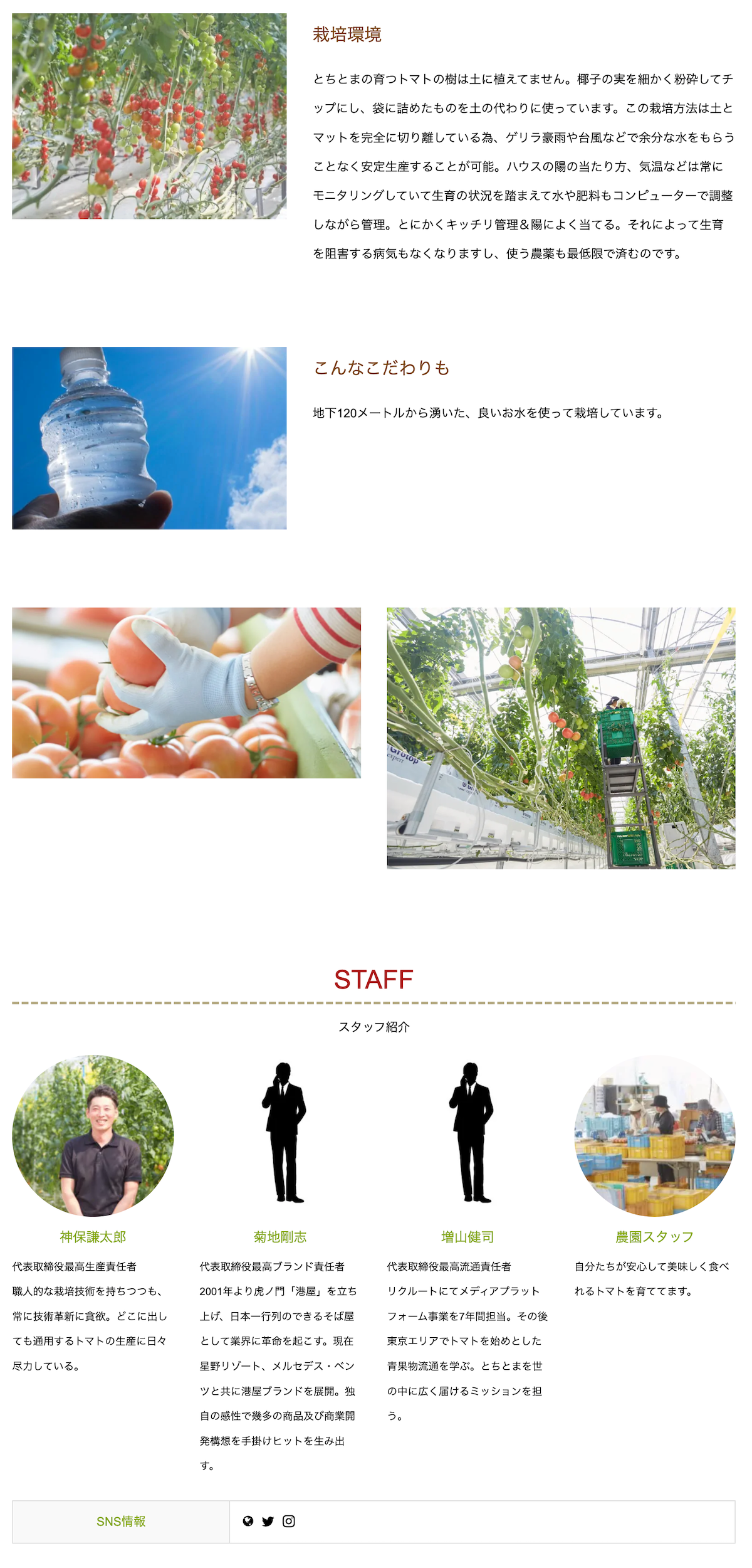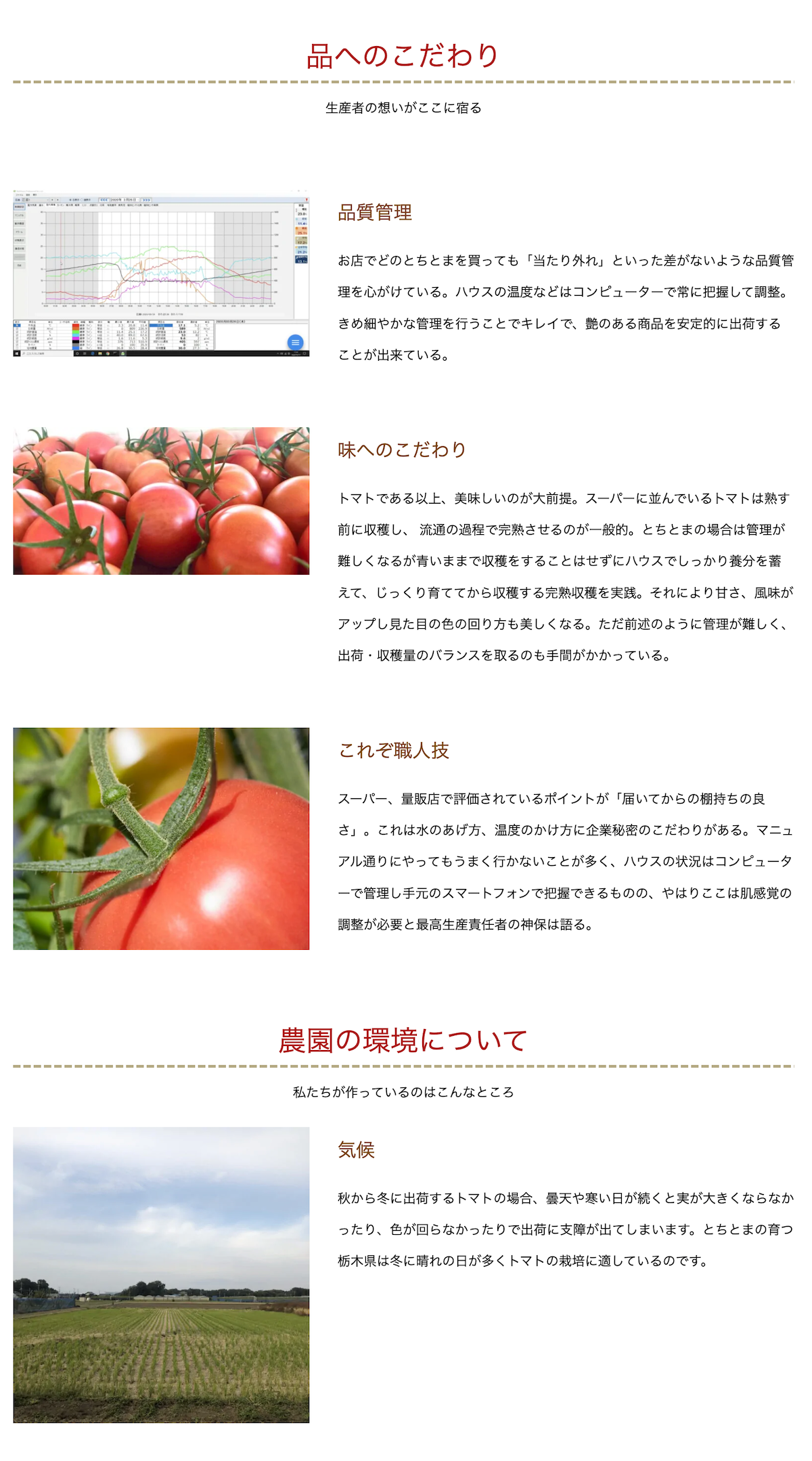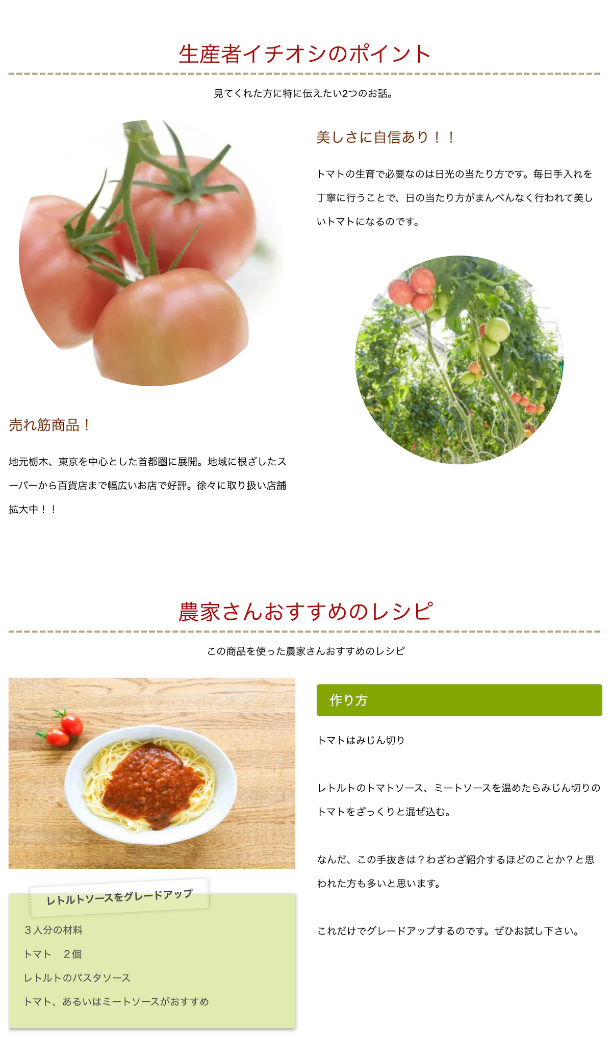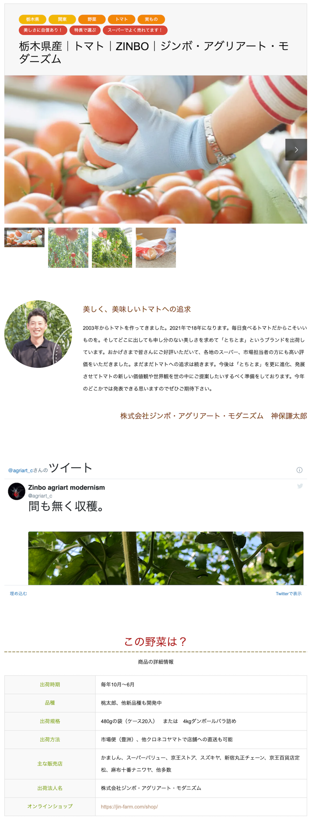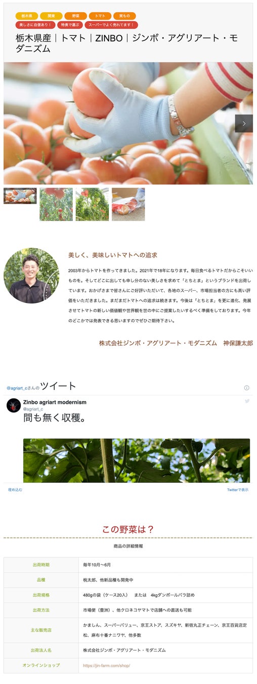 “ひとつの野菜”に対して掲載できる情報が質・量ともに充実しています。出荷時期・品種・出荷規格・主な販売店などの商品情報はもちろんのこと、「生産者イチオシのポイント」「おすすめのレシピ」「農園の環境」「生産者情報」など商品まわりの情報を読みやすいドキュメントと写真(およそ20枚)にまとめて紹介することができます。すっきりと整ったデザインは、パソコン、スマホでも見やすく、消費者の知りたいことやなぜ?に丁寧に応えることができるとともに、既存オンラインショップへ誘導もできます。