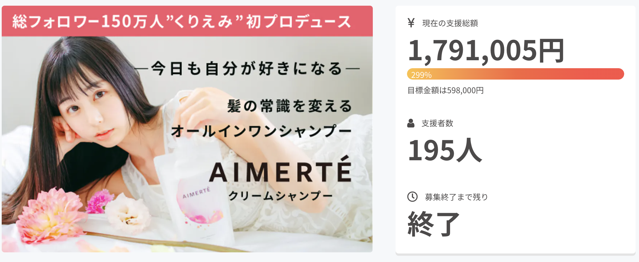 くりえみプロデュースのAIMERTÉクリームシャンプー クラウドファンディングサイトCAMPFIREにて目標対比299%の大幅達成で募集終了 本日より正式販売開始へ