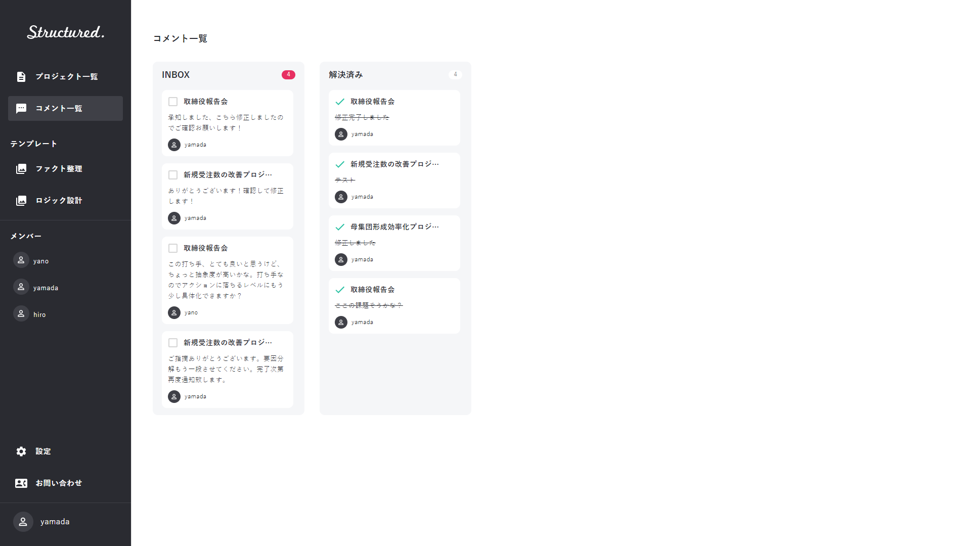 「Structured.」はビジネス現場で求められるロジカルシンキングスキルを、実務をしながら能力開発できるツールです。日々巻き起こる大小様々な問題解決に向けて、簡単操作で問題の因数分解と解決ロジックを構築できます。さらに構造化/可視化された問題解決のアウトプットとして、ツール内でパワーポイントに落とし込むことができ、時短でロジカルなプレゼン資料を完成させることができます。また複数人で作業/コメントできる同時編集機能により、実務の問題解決を通したロジカルシンキングスキル育成のスピードアップを実現しています。