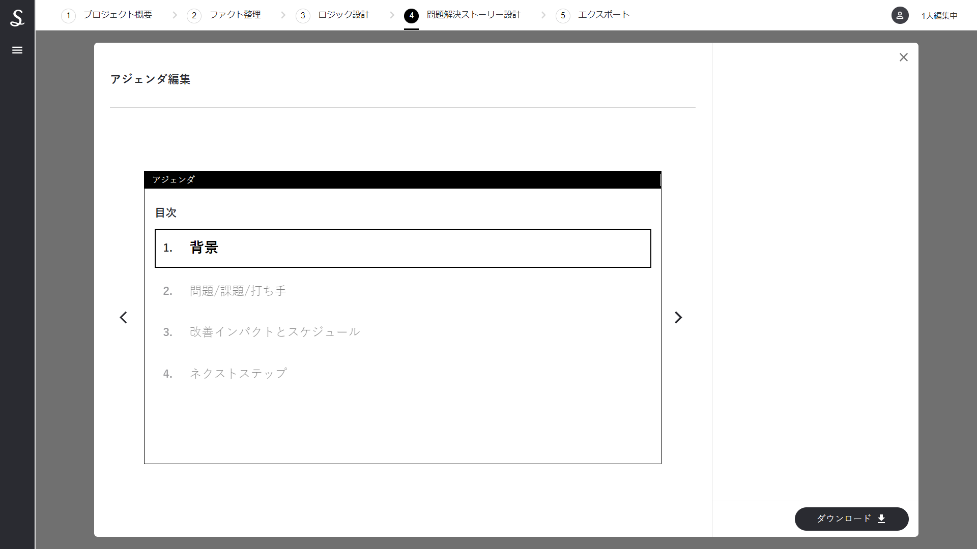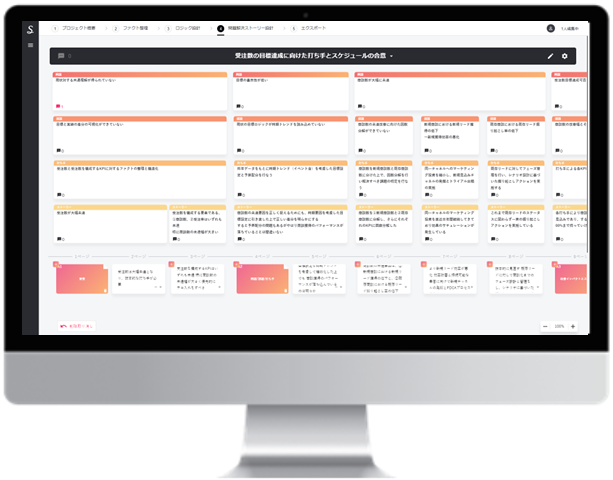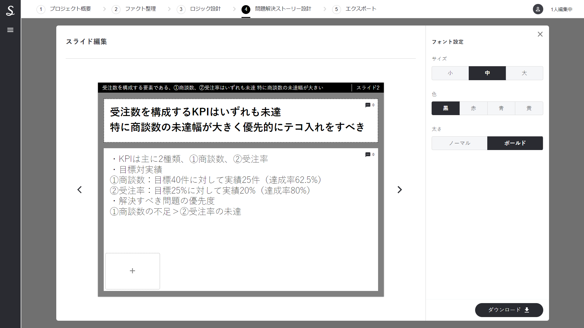 フォームに沿って構造化・可視化した問題解決ロジックは、パワーポイントイメージとして落とし込むことができます。ロジックツリーに基づいた問題解決の組み立てからロジックが担保された資料の作成まで、ワンストップで行うことができます。