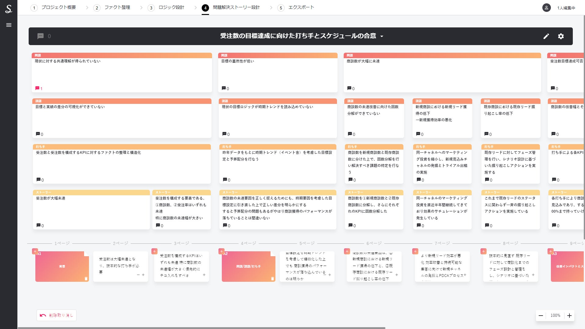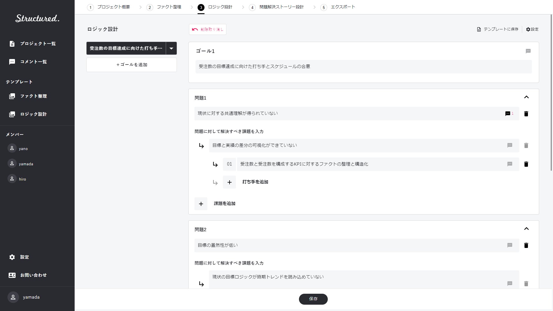 「ファクト整理」(現状整理のための情報列挙)、「ロジック設計」(ゴール設定/問題点や課題点の因数分解/それらに対する解決策の打ち出し)をロジックツリーに基づいたフォームに沿って入力していくことで、問題解決ロジックを構築できます。