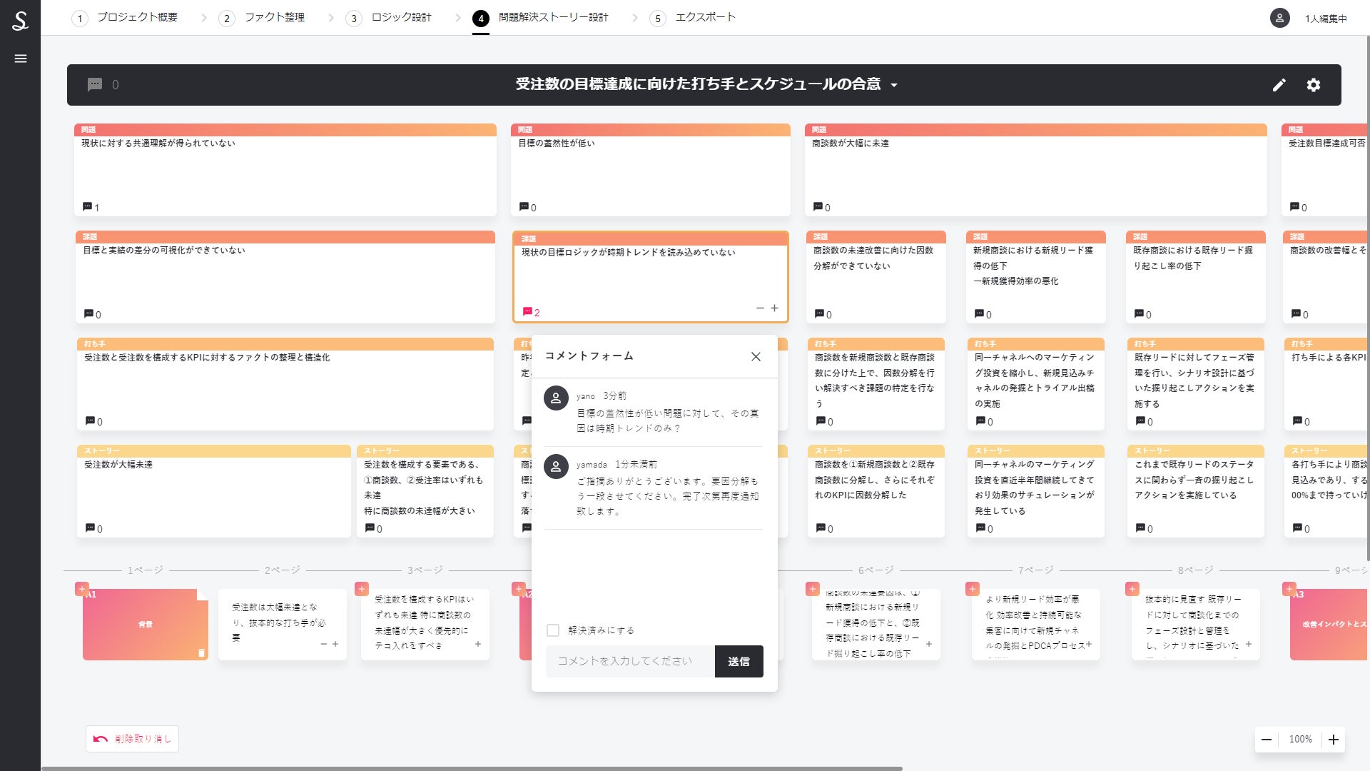 複数人による同時編集が可能なため、問題解決の議論や役割分担等をツール上で簡単に行うことができます。また、修正指示やコメントは各フレームにピンポイントで行うことができ、フィードバックをスピーディーかつ具体的に行うことができます。