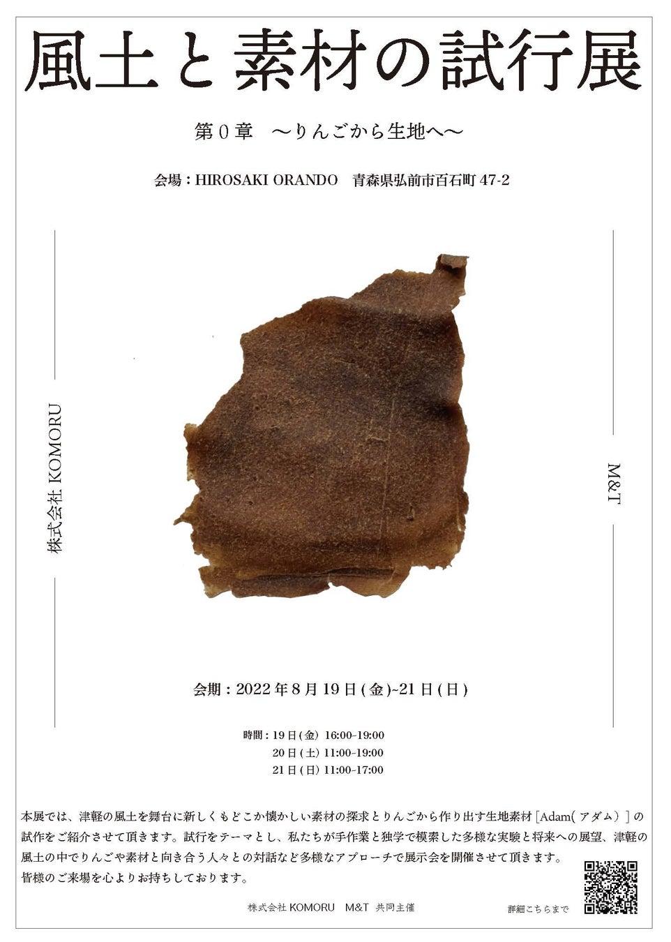 「文化を育てる会社」として青森県五所川原市を拠点に宿事業を展開する株式会社KOMORUは、プロダクトデザインを手掛けるM&Tと連携をし、津軽の持つ風土と素材に着目し可能性を見出す「TSUGARU SOZAI CENTER」を立ち上げました。第一弾として、アップルジュースやシードル製作工程から出る廃棄予定のりんごの残渣を活用した、あたらしい素材「Adam(アダム)」の開発を2021年の夏からスタートし、今回は試作品のお披露目として「風土と素材の試行展」を開催します。