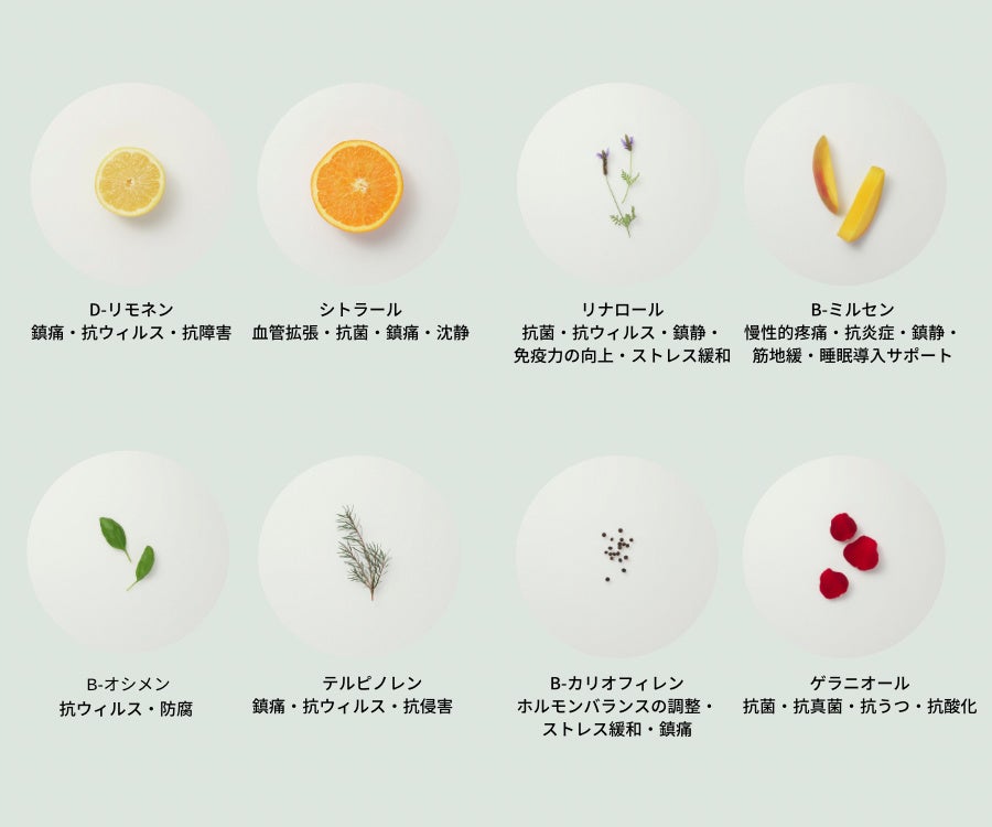 オレンジやレモンに含まれるリモネンや、レモングラスから取れるシトラールなどのテルペンを使用。