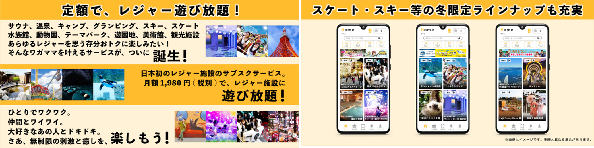 本サービスでは、遊園地・テーマパーク・水族館・動物園・美術館・温泉・サウナ・キャンプ場・グランピング・スケート・スキー・観光施設など様々なジャンルのレジャー施設が「レジャパス!」という1つのプラットフォーム上で入場枠を開放致します。平日プランは月額1,980円、土日祝含むプランで月額2,980円と、入場チケットを都度購入するよりお得に利用いただけます。1ヶ月間1度も利用がない場合は、翌月に「レジャコイン」が付与され、友達や家族を誘える権利に変換され、翌月以降に誰かを誘って遊びに行けることも大きなポイントです。