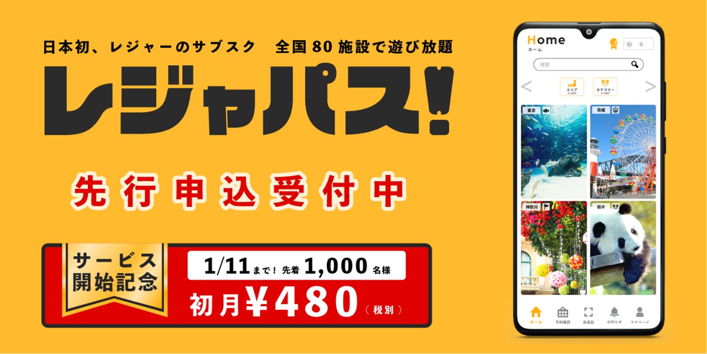 日本初(※)のレジャーのサブスク・年パスアプリ「レジャパス!」 【先着1,000名限定】初月480円の先行予約キャンペーンを開始