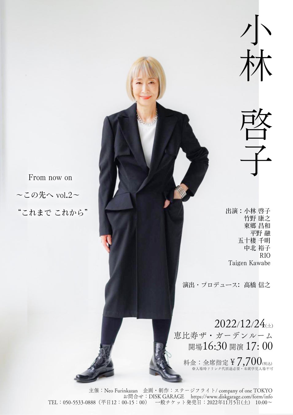 プロデビュー55周年記念コンサート「この先へ」から約1年となる、2022年12月24日(土)、恵比寿ザ・ガーデンルームにて「From now on ~この先へ vol.2~ ”これまで これから”」をタイトルに、小林 啓子コンサートを開催します。
