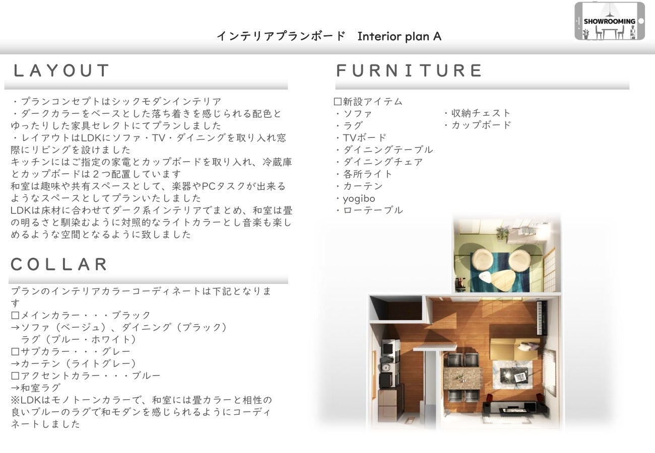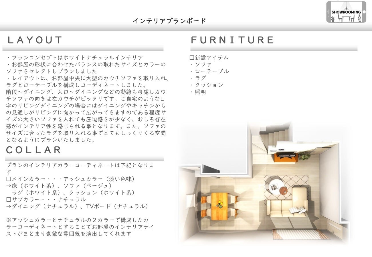 サービスを初めて利用される方、検討中の方、無料で試してみたい方などSHOWROOMINGに興味のあるお客様に向けてかんたん平面レイアウトをプロのインテリアコーディネーターがプランニングしお届けします。