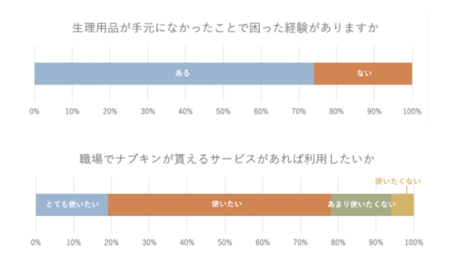 74%の女性が生理用品が手元になく困った経験があり、78%の女性がオフィスに無料でナプキンがもらえるサービスがあったら利用したいと答えている(※1)ことから、オフィスへの生理用品の設置は強く望まれており、「ダイバーシティ&インクルージョン」や女性活躍の推進、従業員満足度の高いオフィス環境の整備など様々な企業課題の解決に寄与いたします。