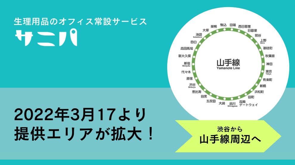 サッカロン株式会社(本社:東京都渋谷区、代表取締役社長:佐藤 悠介、以下「サッカロン」)の提供する生理用品のオフィス常設サービス「サニパ」は、2022年1月19日より渋谷区での提供を開始してまいりました。導入希望の企業からご要望をいただき、2022年3月17日より東京都での提供エリアを山手線の各駅から徒歩15分圏内に拡大いたします。これにより、生理用品の常設施設を増やすことで、女性の負担軽減を支援いたします。