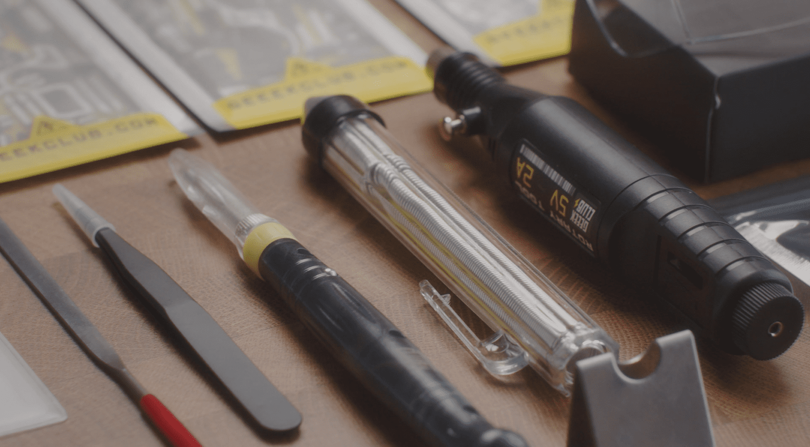 皆さんが自分で工具をそろえる必要はありません。電子工作を開始するのに必要な工具がセットでついてくるので、届いたその日に電子工作を始められます!はんだごて、はんだ線、はんだごてスタンド、ピンセット、やすり、保護メガネ、拡大鏡レンズが付いてきます。