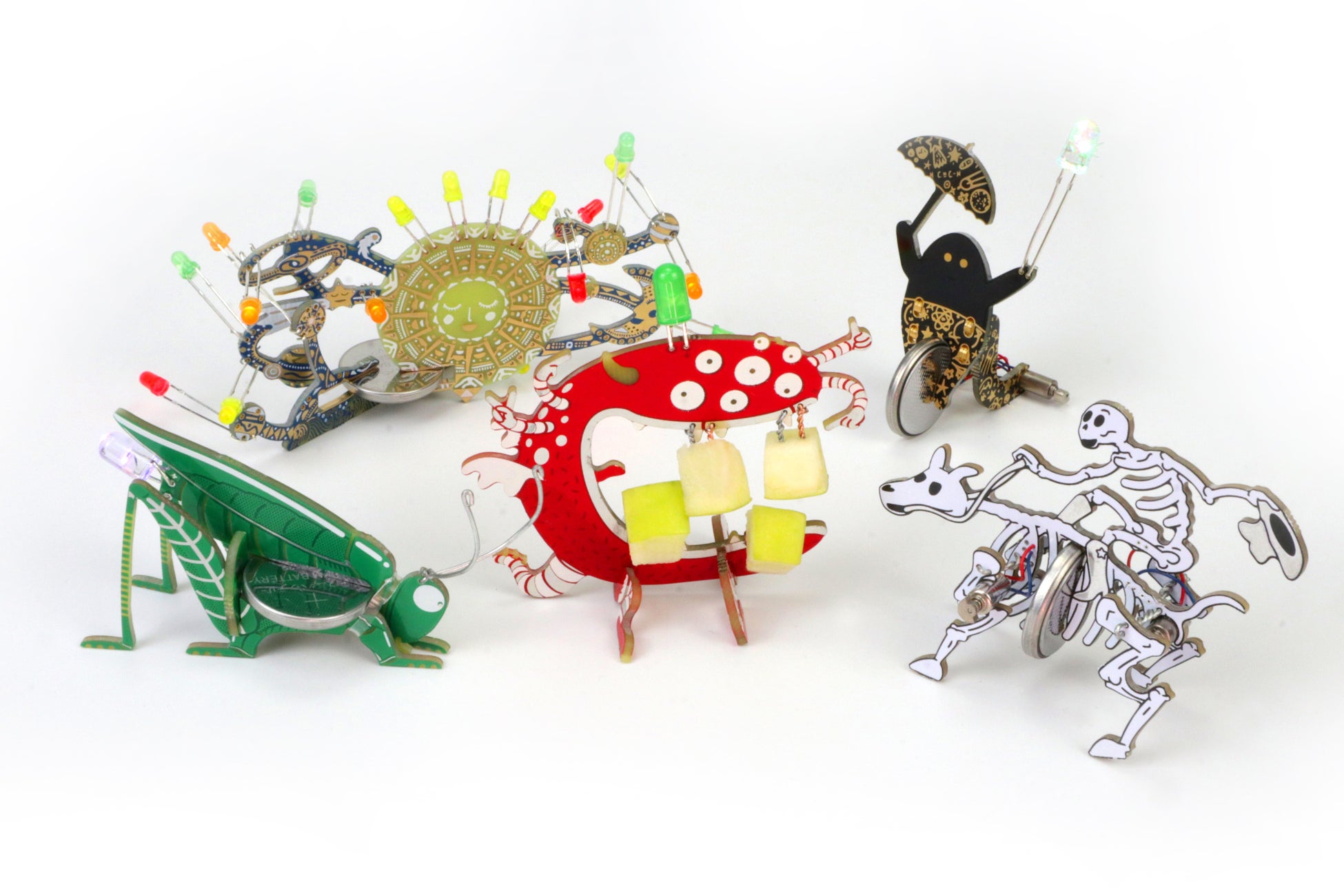 完成したロボットたちはボタン電池を動力にして、ピカピカひかってかわいいしぐさをしてくれます。子どもでも大人でも楽しめる電子工作の世界をぜひお楽しみください!