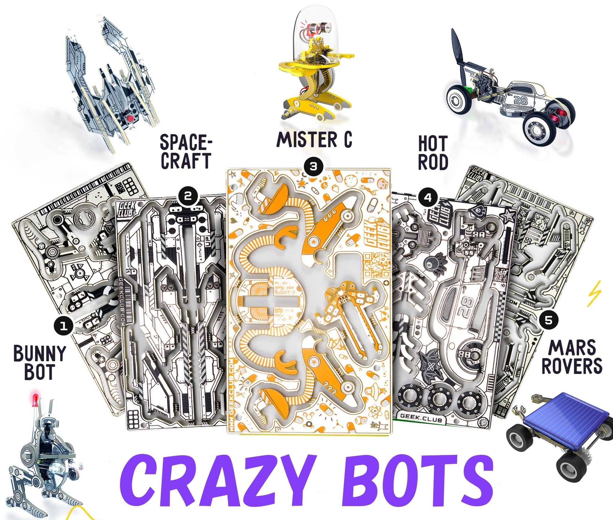 クレイジーボットは、宇宙をガヤガヤとにぎやかに走り回る乗り物やロボットをイメージして誕生しました。作成手順にはんだ付けはありませんので、電子工作が初めての方や子供たちでも、電子工作を楽しく学びながら組み立てられるようになっています。