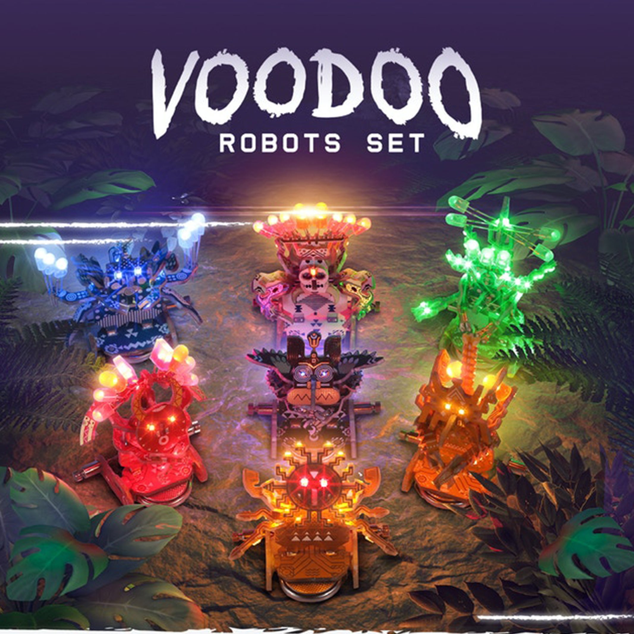 ブードゥーボットシリーズは、「古代文明の部族芸術をロボットにしてみたらどうなるだろう?」、そんなインスピレーションがきっかけで誕生しました。それぞれのロボットには願いがこめられ、お守りをイメージしています。ブードゥーボットを組み立てるためには、はんだ付けが必要です。