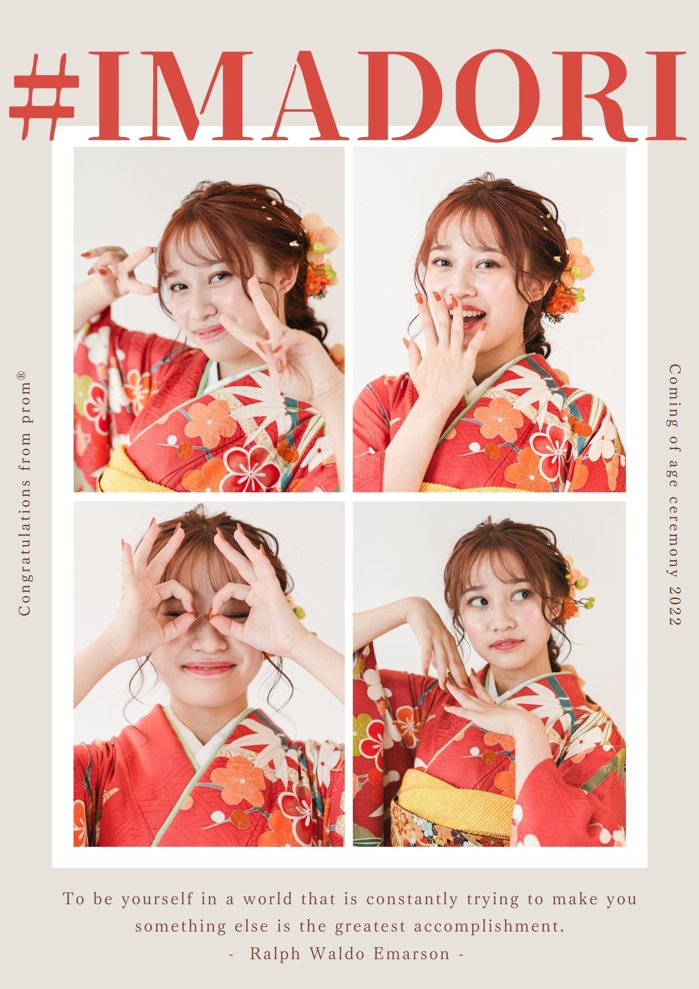 まもなく訪れる1月10日は、二十歳を迎える若者の皆様をお祝いする成人式の日です。門出を祝い、一生に一度しかないこの日の想い出を残すために、多くの方が式に先立ち、前撮りという形で記念撮影をなさっておられます。しかし、前撮りは価格が高額であったり、アルバムと抱き合わせで購入しないと撮影データをもらえなかったりするといった問題があり、敷居が高いと感じられる方も少なからずいらっしゃるのではないでしょうか。そこで今回、私ども株式会社promの若者に向けた取り組みに共感してくださった阪急ウェディング様から振袖を提供していただき、新しい前撮りの形「イマドリ」をご提案することができました。これから成人を迎える方や過去に前撮りができなかった方など全ての方を対象とし、思い出に残る前撮り「イマドリ」を企画し、参加者の皆様に楽しんでいただきました。