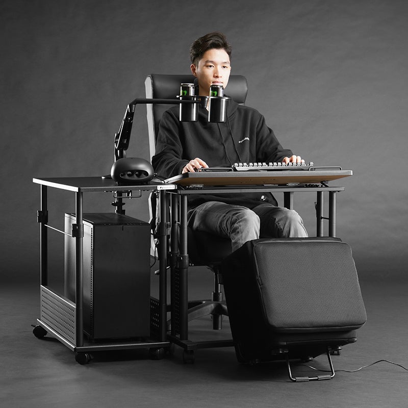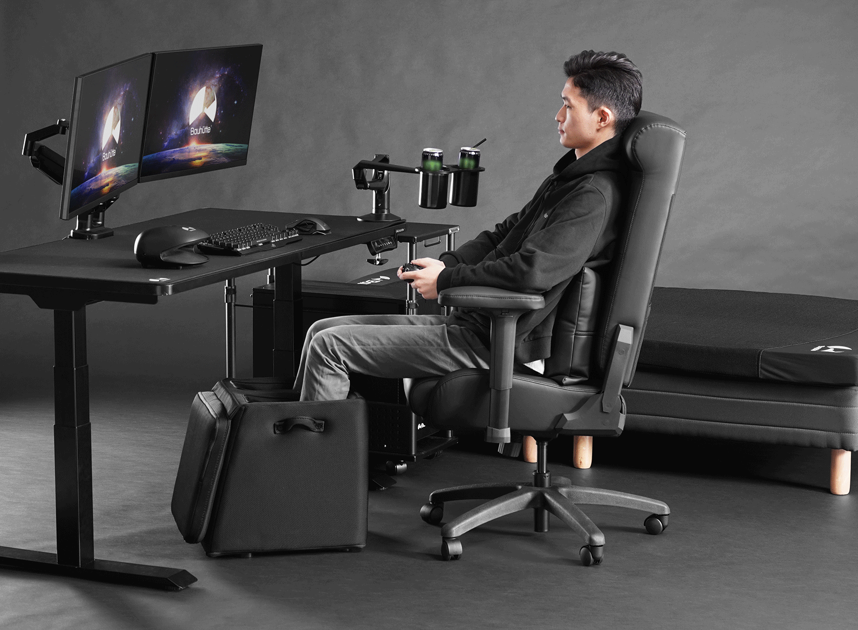 オットマン型マッサージャーが発売。堕落ゲーマー向けに「至れり尽くせり」なデスクを構築します。