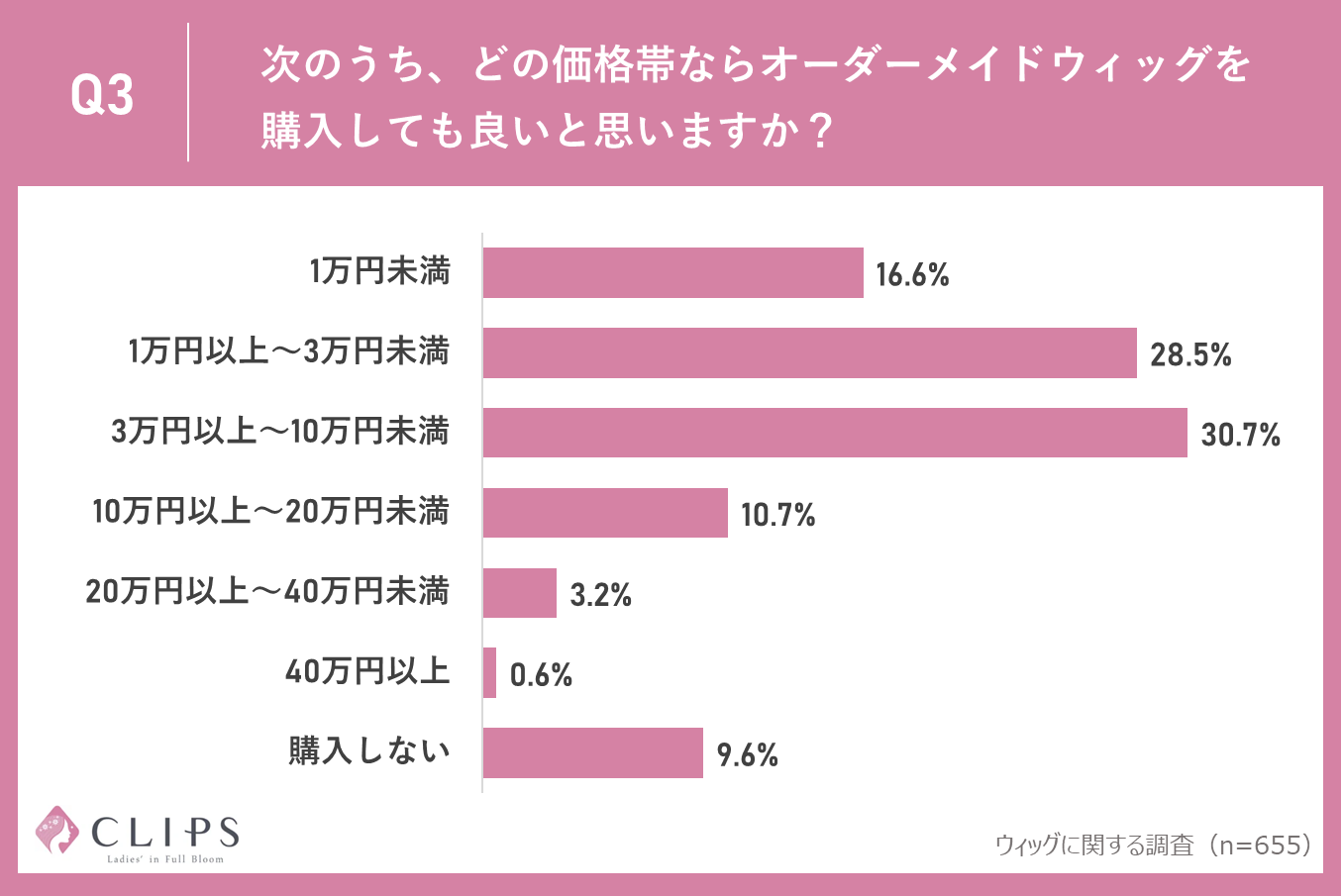 Q3「次のうち、どの価格帯ならオーダーメイドウィッグを購入しても良いと思いますか?」(n=655)の質問に対し、「3万円以上10万円未満」が最も多く30.7%、次いで「1万円以上3万円未満」が28.5%、3番目に「1万円未満」が16.6%ととなり、実際に購入しても良いと思う価格は1万円~10万円未満の低価格帯に75%以上が集中する結果となりました。