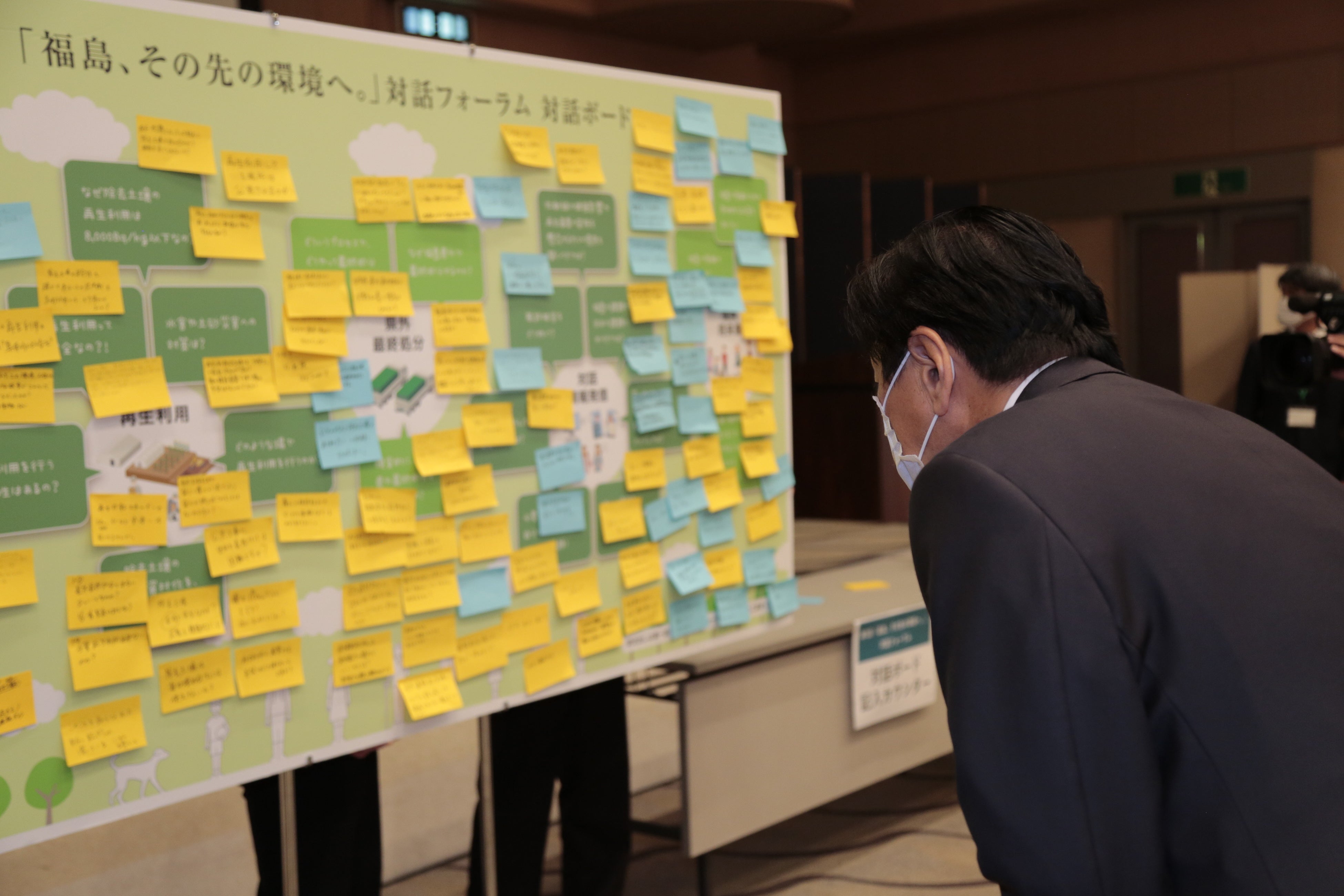 対話セッション前半は、参加登録時や、当日会場及びライブチャットでいただいた御質問・御意見に回答する形で、登壇者の皆さまの専門分野、御経験等や本フォーラムについての思いをお伺いしました。山口大臣は本フォーラムの目的を「2045年までに除去土壌を福島県外で最終処分することが法律で決まっているが、現状の認知度は福島県内で約5割、福島県外では約2割。多くの方々に除去土壌の課題について知っていただき、再生利用の必要性・安全性を御理解いただきたい。」と語りました。