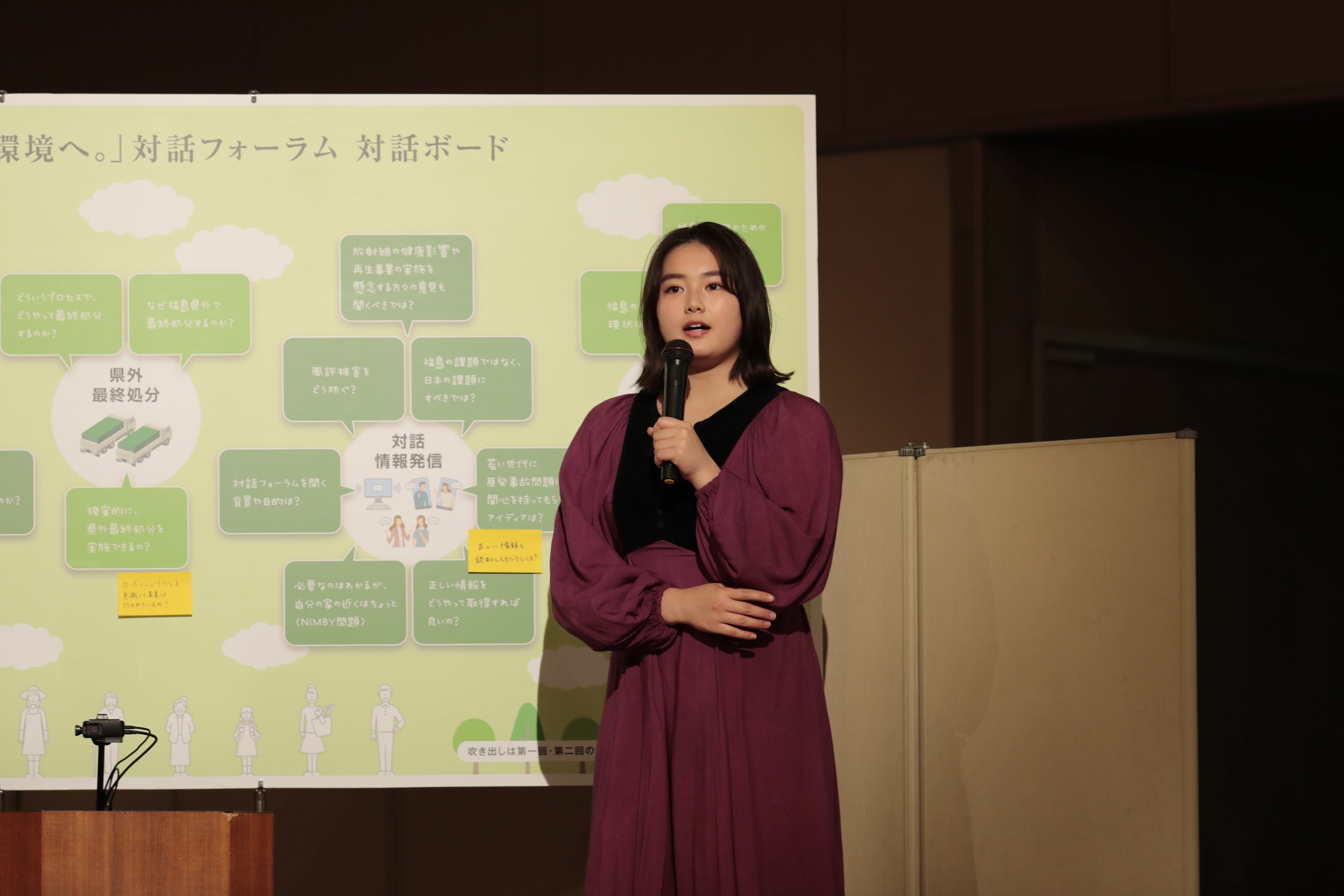 また、高村教授は「福島だけの問題ではなく、日本全体の問題として考えないといけない。放射線について理解しながら、福島に思いを寄せていくところにフォーラムの意義がある。」と話しました。続いて、学生の立場として登壇された足立さんは、「風評被害や偏見をなくすためにも、正しい情報が行き渡ってほしいです。」と思いの丈を話しました。