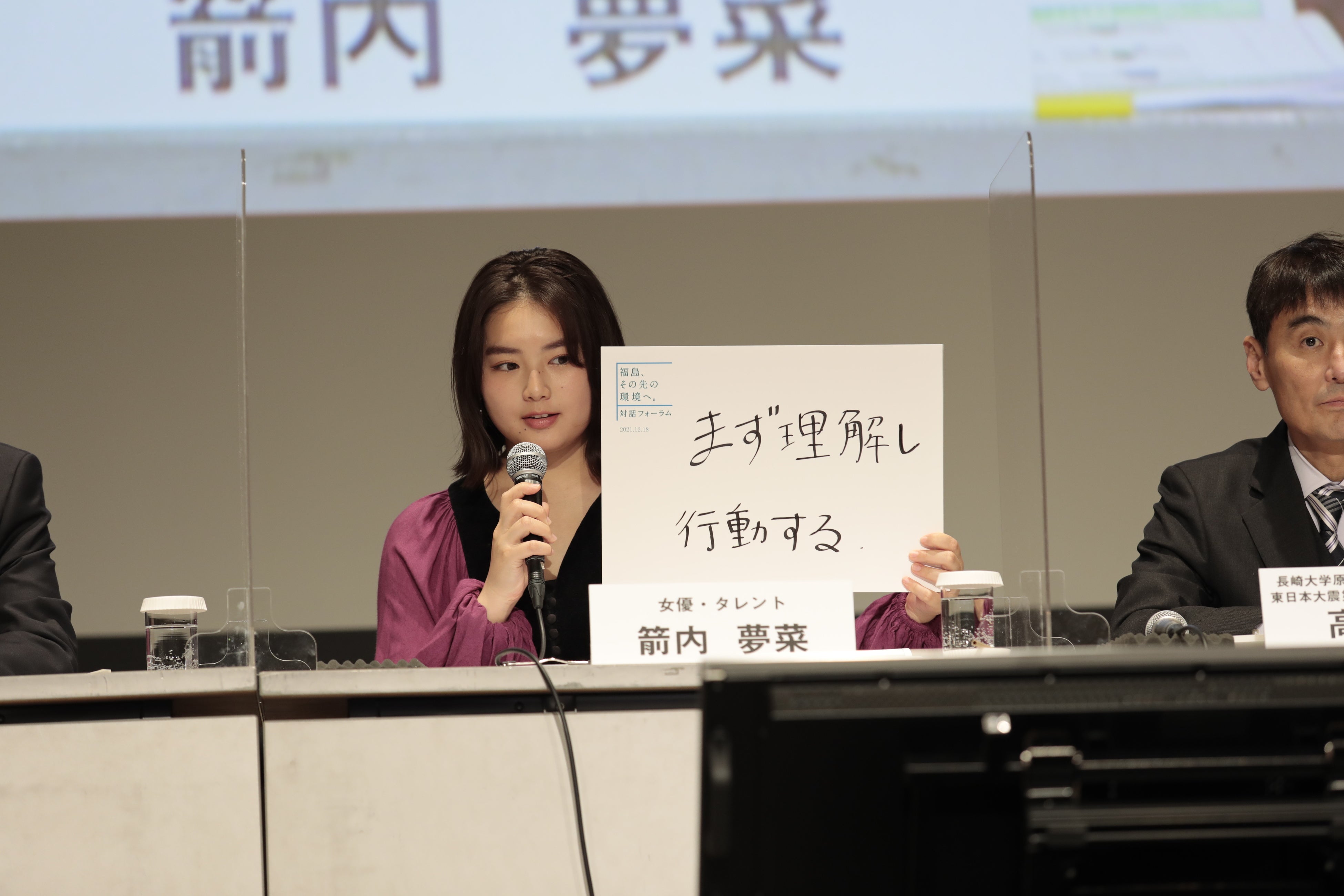 この取組の一環として、減容・再生利用の必要性・安全性等に関する理解醸成を図る対話集会を全国各地で開催することとしており、第一弾として令和3年5月23日(日)に、第二弾として令和3年9月11日(土)に「『福島、その先の環境へ。』対話フォーラム」を開催しました。この度、令和3年12月18日(土)に第三弾として、「『福島、その先の環境へ。』対話フォーラム」を名古屋国際会議場にて実施しました。当日は環境大臣の山口壯氏のほか、長崎大学の高村昇教授、東京大学の開沼博准教授、Z世代の代表として福島県出身で女優、タレントとして活躍されている箭内夢菜さん、学生の足立理子さん、笠井遥さんに登壇いただきました。