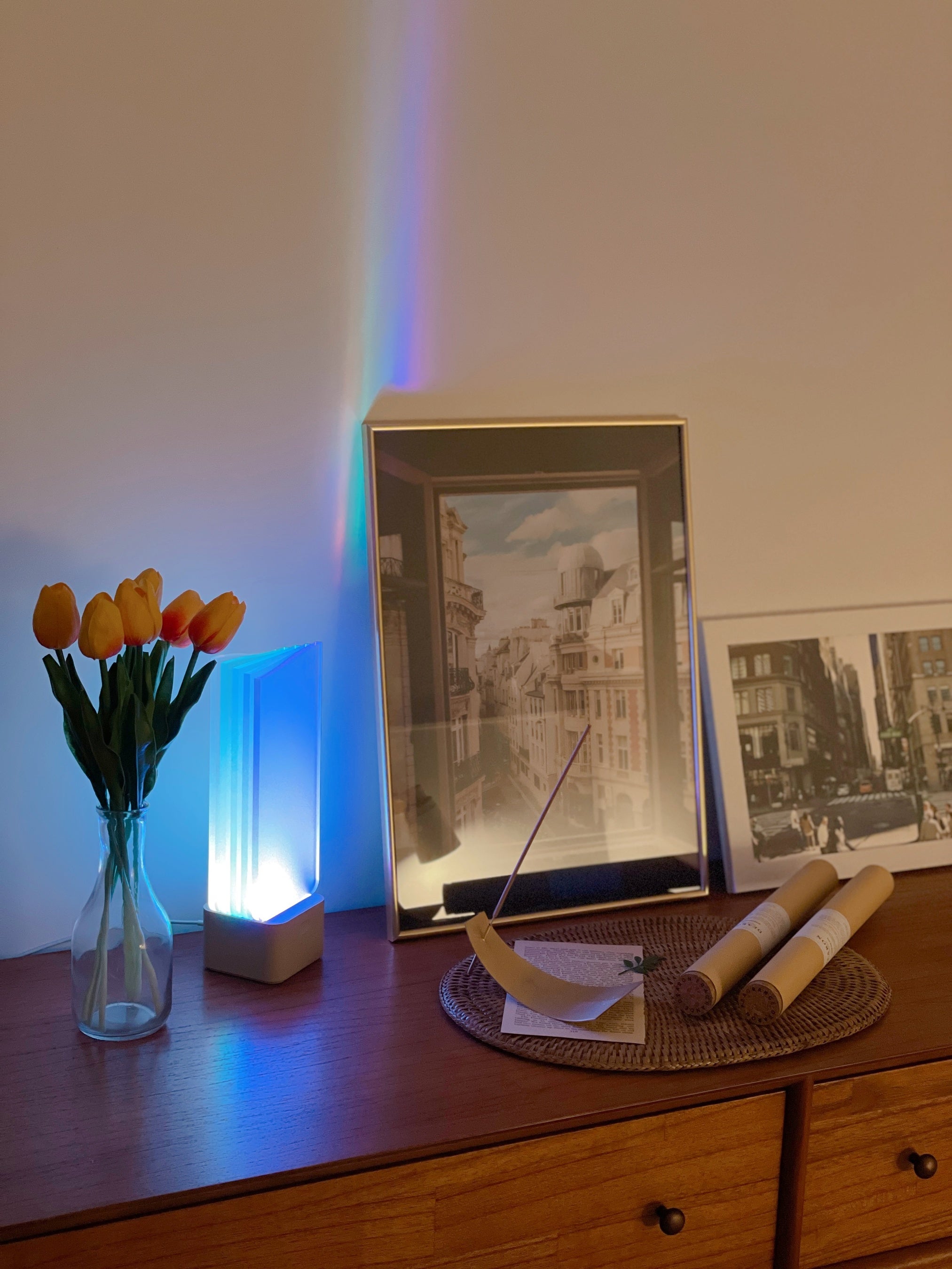 - 部屋や気分に合わせて光の色をワンタッチ変更。高級感あるアクリル製でそのままインテリアにも