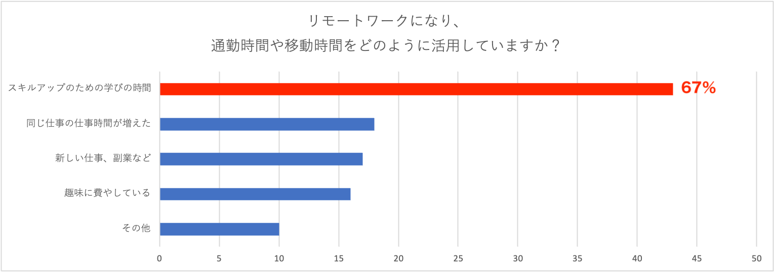 - リモートワークになり、通勤時間や移動時間を67%の人が「スキルアップのための勉強」を行っています