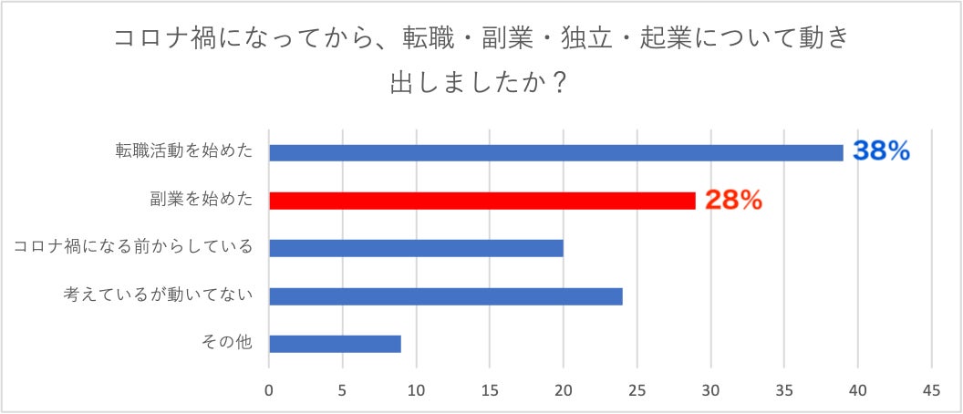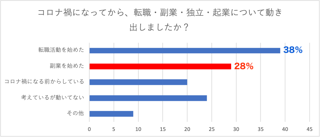 - 28%の人が、コロナ禍になってから副業を実現。 38%の人が、転職活動を始めています