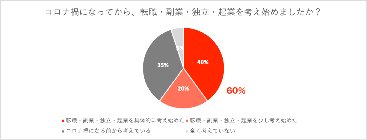 - 60%の人が、コロナ禍になってから、副業、独立、起業を考え始めています