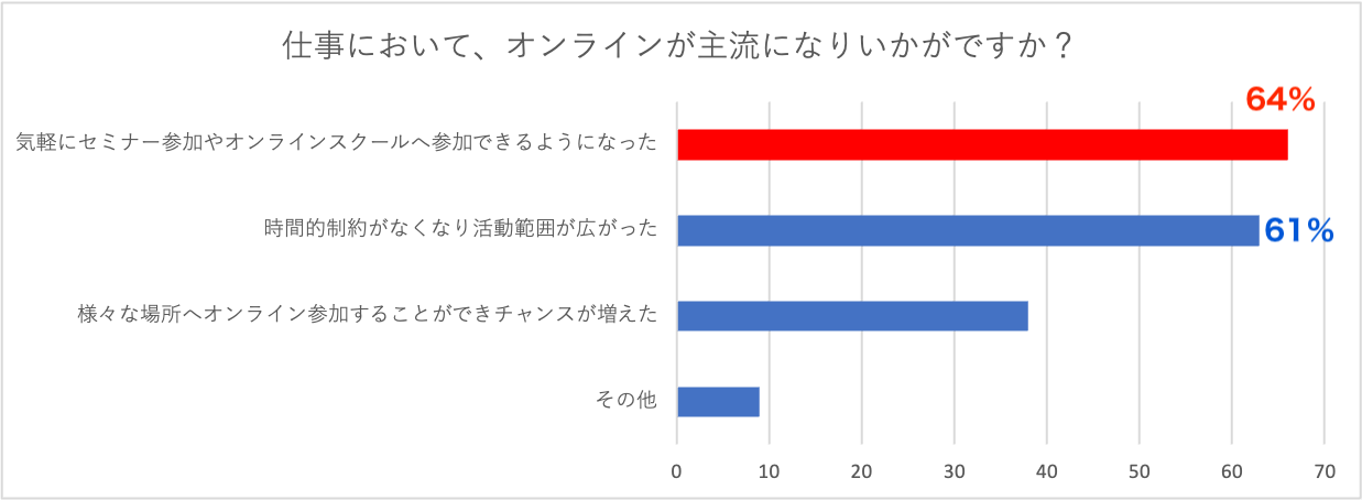 - 64%の人がオンラインスクールやセミナーへ参加し、61%の人の活動範囲が広がっています