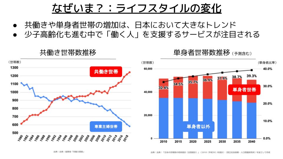 少子化高齢化に伴い子育て支援の必要性が論じられる中、共働き世帯や単身者世帯の増加で「働く人」を支援するサービスが社会的に求められています。WASHBOXは家事の中の「洗濯」にフォーカスすることで年間430時間(市場規模換算:5.2兆円)の家庭内洗濯労働にアプローチいたします。