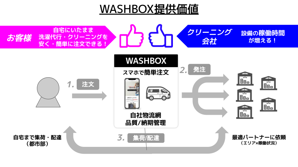 クリーニング工場の遊休資産を活用することでユーザーとクリーニング工場の両方がWin-WinとなることがWASHBOXの提供価値です。