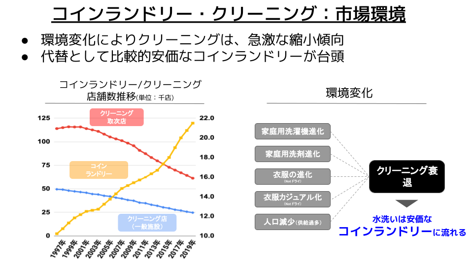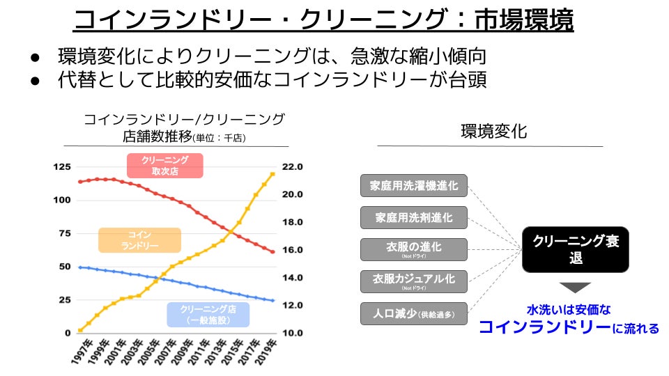 家庭用洗濯機の進化や衣服のカジュアル化などをの外的環境の変化に伴い、クリーニング業界は苦境に立たされています。2000年の160万施設が2019年には半分近くまで減少、さらにコロナがこの傾向に拍車を掛けています。このようなクリーニング業界に対して「洗濯代行」という今までアプローチできていなかった家庭内洗濯の需要をWASHBOXを通じて業界に還元していく予定です。